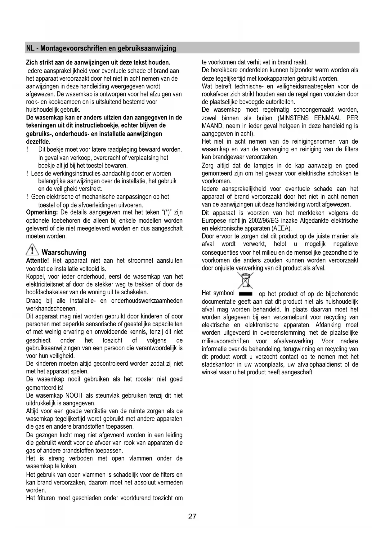 ppuyez sur la touche pendant 3 secondes, l’électronique de commande de la hotte est exclue. Cette fonction peut être utile pendant l’opération de nettoyage du produit. Pour réinsérer l’électronique, il suffira de répéter l’opération. Si la hotte ne fonctionne pas correctement, débranchez la prise pendant environ 5 secondes, puis rebranchez-la. Si le problème persiste, contactez le service de réparation compétent.26 Entretien Attention! Avant toute opération de nettoyage ou d’entretien, débrancher la hotte du circuit électrique en enlevant la prise ou en coupant l’interrupteur général de l’habitation. Nettoyage La hotte doit être régulièrement nettoyée à l’intérieur et à l’extérieur (au moins à la même fréquence que pour l’entretien des filtres à graisse). Pour le nettoyage, utiliser un chiffon humidifié avec un détergent liquide neutre. Ne pas utiliser de produit contenant des abrasifs. NE PAS UTILISER D'ALCOOL! ATTENTION: Il y a risque d’incendie si vous ne respectez pas les instructions concernant le nettoyage de l’appareil et le remplacement ou le nettoyage du filtre. La responsabilité du constructeur ne peut en aucun cas être engagée dans le cas d’un endommagement du moteur ou d’incendie liés à un entretien négligé ou au non respect des consignes de sécurité précédemment mentionnées. Filtre anti-gras Fig. 19-25 Il retient les particules de graisse issues de la cuisson. Le filtre doit être nettoyé une fois par mois (ou lorsque le système d’indication de saturation des filtres – si prévu sur le modèle possédé – indique cette nécessité) avec des détergents non agressifs, à la main ou dans le lave-vaisselle à faibles températures et cycle rapide. Le lavage du filtre anti-graisse métallique au lave-vaisselle peut en provoquer la décoloration. Toutefois, les caractéristiques de filtrage ne seront en aucun cas modifiées. Pour démonter le filtre anti-graisse, tirer la poignée de décrochement à ressort. Filtre à charbon actif (uniquement pour version recyclage) Fig. 23 Retient les odeurs désagréables de cuisson. Le filtre au charbon peut être lavé tous les deux mois (ou quand le système d’indication de saturation des filtres - si prévu sur le modèle - indique cette nécessité) à l’eau chaude et avec des détergents adaptés ou au lave-vaisselle à 65°C (en cas de lavage au lave-vaisselle, effectuer le cycle de lavage complet sans vaisselle à l’intérieur). Enlever l’eau en excès sans abîmer le filtre, et le placer ensuite dans le four pendant 10 minutes à 100°C pour le sécher complètement. Remplacer le tissus matelassé tous les 3 ans et chaque fois qu’il apparaît abîmé. Remplacement des lampes La hotte est dotée d’un système d’éclairage basé sur la technologie LED. Les LEDS garantissent un éclairage optimal, une durée jusqu’à 10 fois supérieures aux ampoules traditionnelles et permettent une épargne de 90% en énergie électrique. Pour le remplacement, s’adresser au service d’assistance technique.27 NL - Montagevoorschriften en gebruiksaanwijzing Zich strikt aan de aanwijzingen uit deze tekst houden. Iedere aansprakelijkheid voor eventuele schade of brand aan het apparaat veroorzaakt door het niet in acht nemen van de aanwijzingen in deze handleiding weergegeven wordt afgewezen. De wasemkap is ontworpen voor het afzuigen van rook- en kookdampen en is uitsluitend bestemd voor huishoudelijk gebruik. De wasemkap kan er anders uitzien dan aangegeven in de tekeningen uit dit instructieboekje, echter blijven de gebruiks-, onderhouds- en installatie aanwijzingen dezelfde. ! Dit boekje moet voor latere raadpleging bewaard worden. In geval van verkoop, overdracht of verplaatsing het boekje altijd bij het toestel bewaren. ! Lees de werkingsinstructies aandachtig door: er worden belangrijke aanwijzingen over de installatie, het gebruik en de veiligheid verstrekt. ! Geen elektrische of mechanische aanpassingen op het toestel of op de afvoerleidingen uitvoeren. Opmerking: De details aangegeven met het teken “(*)” zijn optionele toebehoren die alleen bij enkele modellen worden geleverd of die niet meegeleverd worden en dus aangeschaft moeten worden. Waarschuwing Attentie! Het apparaat niet aan het stroomnet aansluiten voordat de installatie voltooid is. Koppel, voor ieder onderhoud, eerst de wasemkap van het elektriciteitsnet af door de stekker weg te trekken of door de hoofdschakelaar van de woning uit te schakelen. Draag bij alle installatie- en onderhoudswerkzaamheden werkhandschoenen. Dit apparaat mag niet worden gebruikt door kinderen of door personen met beperkte sensorische of geestelijke capaciteiten of met weinig ervaring en onvoldoende kennis, tenzij dit niet geschiedt onder het toezicht of volgens de gebruiksaanwijzingen van een persoon die verantwoordelijk is voor hun veiligheid. De kinderen moeten altijd gecontroleerd worden zodat zij niet met het apparaat spelen. De wasemkap nooit gebruiken als het rooster niet goed gemonteerd is! De wasemkap NOOIT als steunvlak gebruiken tenzij dit niet uitdrukkelijk is aangegeven. Altijd voor een goede ventilatie van de ruimte zorgen als de wasemkap tegelijkertijd wordt gebruikt met andere apparaten die gas en andere brandstoffen toepassen. De gezogen lucht mag niet afgevoerd worden in een leiding die gebruikt wordt voor de afvoer van rook van apparaten die gas of andere brandstoffen toepassen. Het is streng verboden met open vlammen onder de wasemkap te koken. Het gebruik van open vlammen is schadelijk voor de filters en kan brand veroorzaken, daarom moet het absoluut vermeden worden. Het frituren moet geschieden onder voortdurend toezicht om te voorkomen dat verhit vet in brand raakt. De bereikbare onderdelen kunnen bijzonder warm worden als deze tegelijkertijd met kookapparaten gebruikt worden. Wat betreft technische- en veiligheidsmaatregelen voor de rookafvoer zich strikt houden aan de regelingen voor