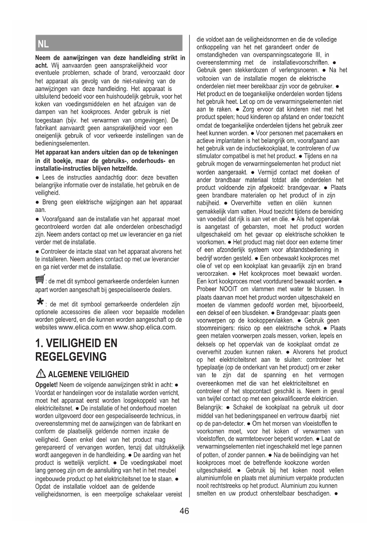 Si le problème persiste après les susdites vérifications, contacter le Service Clientèle le plus proche. 45NL Neem de aanwijzingen van deze handleiding strikt in acht. Wij aanvaarden geen aansprakelijkheid voor eventuele problemen, schade of brand, veroorzaakt door het apparaat als gevolg van de niet-naleving van de aanwijzingen van deze handleiding. Het apparaat is uitsluitend bedoeld voor een huishoudelijk gebruik, voor het koken van voedingsmiddelen en het afzuigen van de dampen van het kookproces. Ander gebruik is niet toegestaan (bijv. het verwarmen van omgevingen). De fabrikant aanvaardt geen aansprakelijkheid voor een oneigenlijk gebruik of voor verkeerde instellingen van de bedieningselementen. Het apparaat kan anders uitzien dan op de tekeningen in dit boekje, maar de gebruiks-, onderhouds- en installatie-instructies blijven hetzelfde. ● Lees de instructies aandachtig door: deze bevatten belangrijke informatie over de installatie, het gebruik en de veiligheid. ● Breng geen elektrische wijzigingen aan het apparaat aan. ● Voorafgaand aan de installatie van het apparaat moet gecontroleerd worden dat alle onderdelen onbeschadigd zijn. Neem anders contact op met uw leverancier en ga niet verder met de installatie. ● Controleer de intacte staat van het apparaat alvorens het te installeren. Neem anders contact op met uw leverancier en ga niet verder met de installatie. : de met dit symbool gemarkeerde onderdelen kunnen apart worden aangeschaft bij gespecialiseerde dealers. : de met dit symbool gemarkeerde onderdelen zijn optionele accessoires die alleen voor bepaalde modellen worden geleverd, en die kunnen worden aangeschaft op de websites www.elica.com en www.shop.elica.com.