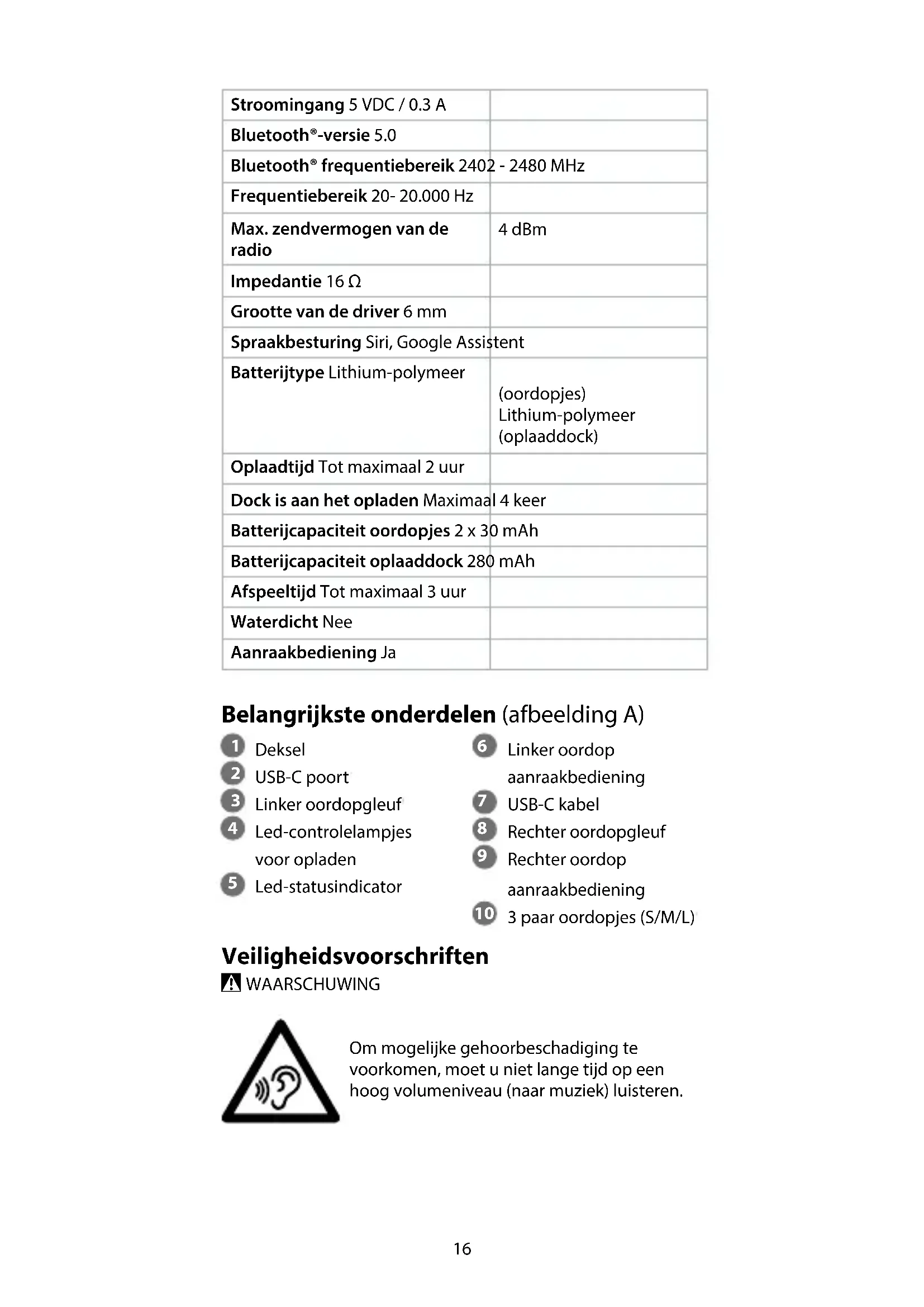 WAARSCHUWING Om mogelijke gehoorbeschadiging te voorkomen, moet u niet lange tijd op een hoog volumeniveau (naar muziek) luisteren.17