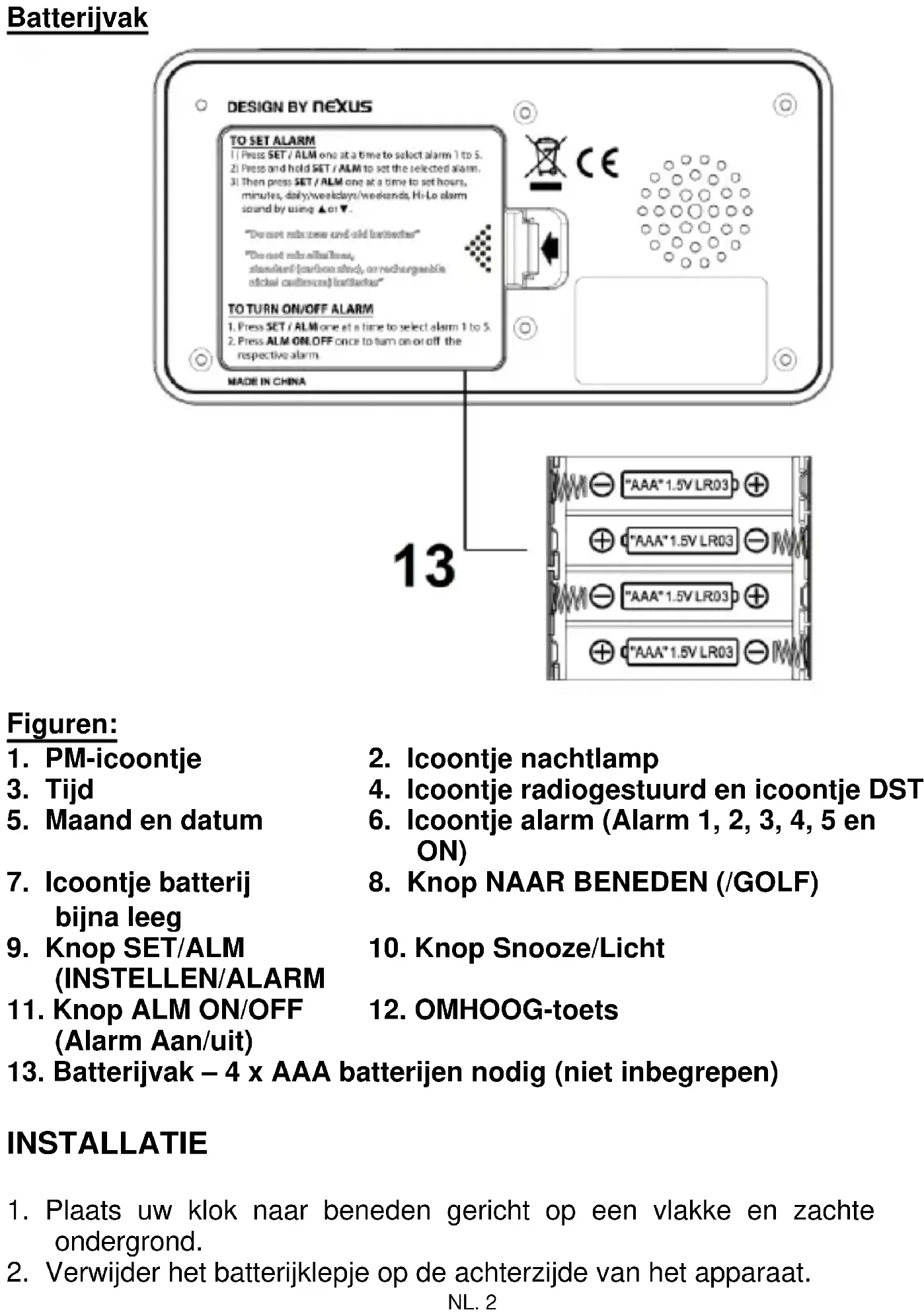 13. Batterijvak – 4 x AAA batterijen nodig (niet inbegrepen)