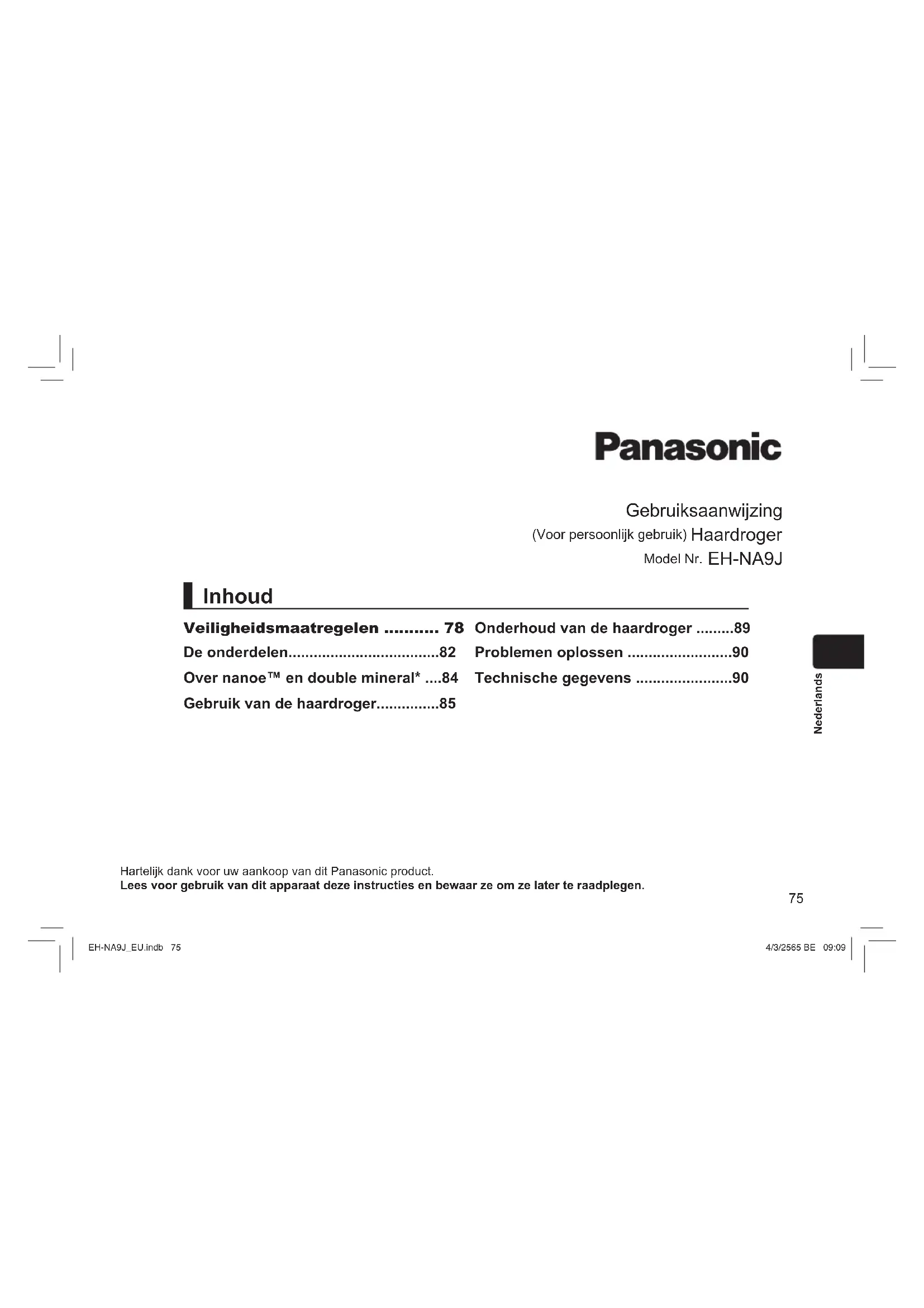 - Laat het apparaat niet achter terwijl er nog kapselproducten of cosmetica op zitten. Dit tast de kunststof aan, wat leidt tot verkleuring en barsten. alcoholpolish remover EH-NA9J_EU.indb 89EH-NA9J_EU.indb 89 4/3/2565 BE 09:094/3/2565 BE 09:0990 Nederlands Problemen oplossen Probleem Mogelijke oorzaak Actie Wanneer de stand [HOT] wordt gebruikt, zijn binnenin mogelijk vonken te zien. (Deze vonken worden veroorzaakt door de thermostaatschakelaar, dit is de beveiligingsinrichting, en zijn niet gevaarlijk.) Stof zit vast op de luchtinlaat of luchtuitlaat. Haar of iets anders verstopt de luchtinlaat. Verwijder het vastgekoekte stof. (Zie pagina 89.) Warme lucht verandert herhaaldelijk in koude lucht. Verstop de luchtinlaat niet. De warme lucht is abnormaal heet. De stekker is abnormaal heet. De stekker zit niet goed in het stopcontact. Gebruik een stopcontact waarin de stekker goed past. Vonken worden gegenereerd in de nanoe™-uitlaat. Het naaldvormige gedeelte aan de achterzijde van de nanoe™-uitlaat is vuil. Voer onderhoud uit aan de nanoe™-uitlaat. (Zie pagina 89.) U hoort een geluid (geknetter) aan de binnenzijde van de nanoe™-uitlaat. U ruikt een speciale geur. Dit is te verklaren doordat nanoe™ en mineraalionen een speciale geur produceren; dit heeft geen invloed op uw lichaam. Er vliegen waterdruppeltjes uit de nanoe™- uitlaat. Wanneer u nanoe™ genereert, zullen er zo nu en dan druppeltjes uit de nanoe™-uitgang vliegen; dit is niet ongewoon. Het lampje [HOT] knippert snel (twee keer per seconde). Apparaat defect. Raadpleeg een erkend servicecenter om het apparaat te laten repareren. Als het probleem nog niet steeds kan worden verholpen, neemt u contact op met de winkel waar u het apparaat heeft gekocht, of met een door Panasonic erkend servicecenter, om het apparaat te laten repareren. Technische gegevens Productmodel EH-NA9J Stroombron 220 V