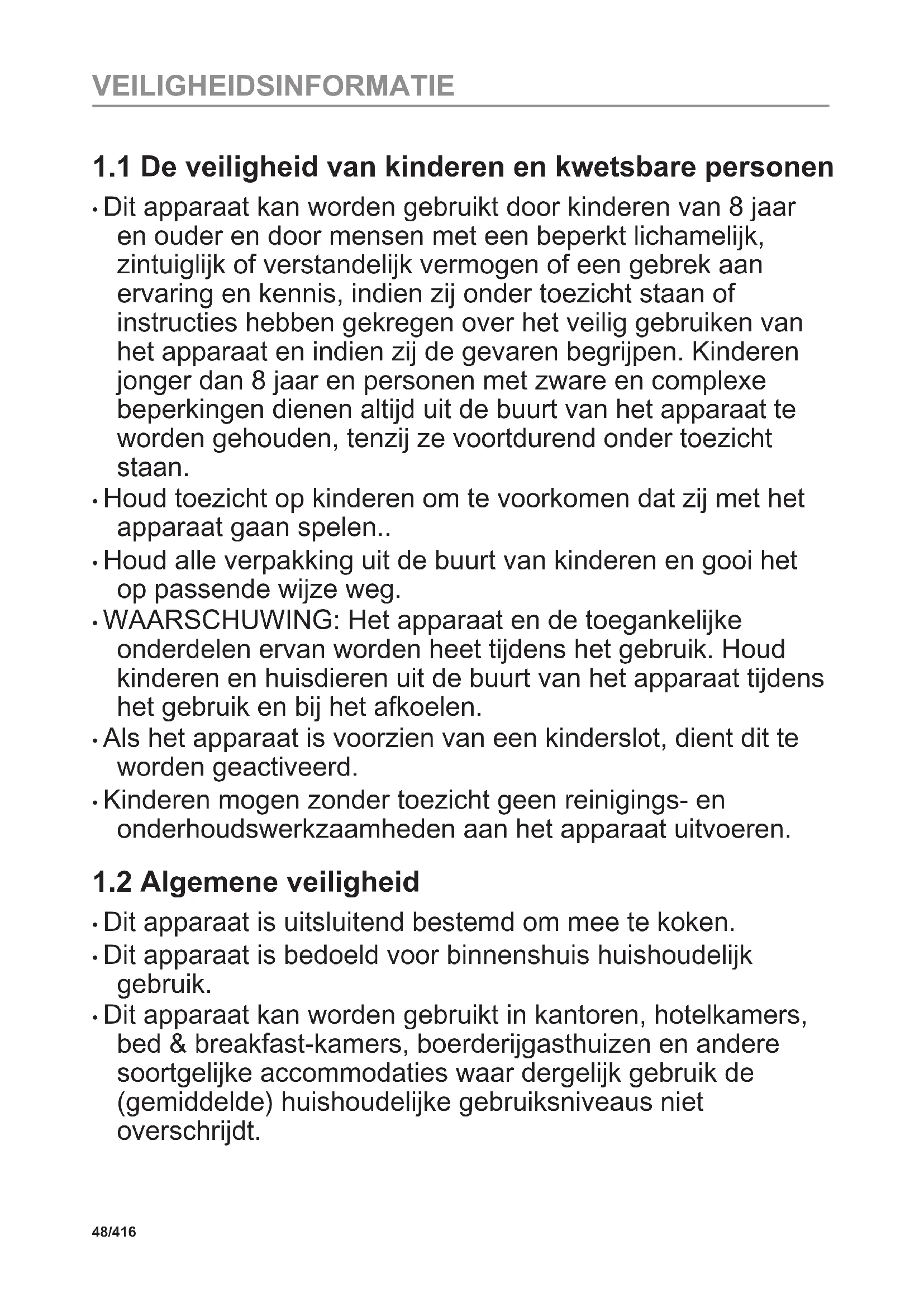 Lees zorgvuldig de meegeleverde instructies voor installatie en gebruik van het apparaat. De fabrikant is niet verantwoordelijk voor verwondingen of schade die voortvloeit uit de onjuiste installatie of het onjuiste gebruik. Bewaar de instructies altijd op een veilige, toegankelijke plek voor toekomstig gebruik. 47/416 VEILIGHEIDSINFORMATIE1.1 De veiligheid van kinderen en kwetsbare personen