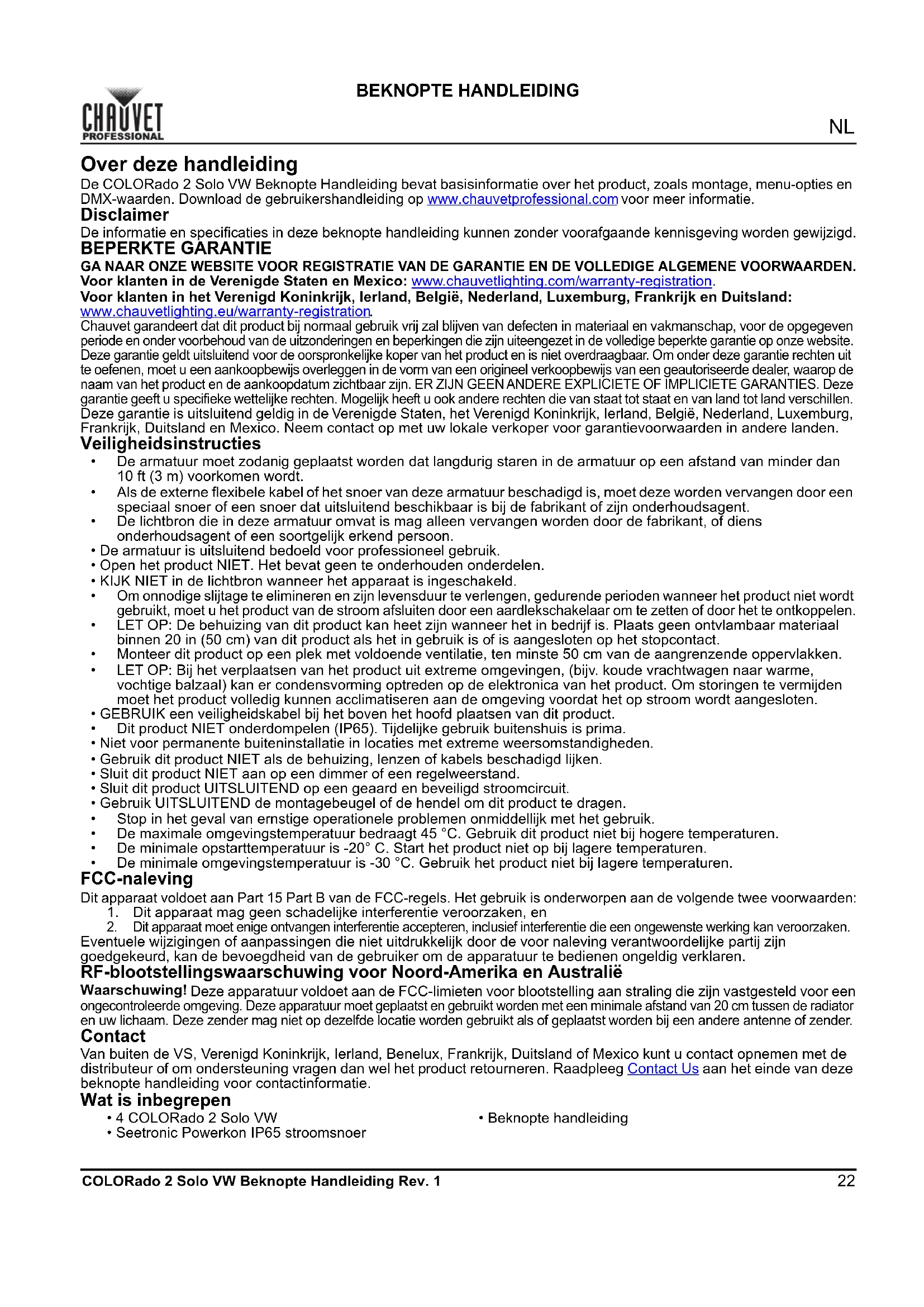 COLORado 2 Solo VW Beknopte Handleiding Rev. 1 BEKNOPTE HANDLEIDING Over deze handleiding De COLORado 2 Solo VW Beknopte Handleiding bevat basisinformatie over het product, zoals montage, menu-opties en DMX-waarden. Download de gebruikershandleiding op www.chauvetprofessional.com voor meer informatie. Disclaimer De informatie en specificaties in deze beknopte handleiding kunnen zonder voorafgaande kennisgeving worden gewijzigd. BEPERKTE GARANTIE GA NAAR ONZE WEBSITE VOOR REGISTRATIE VAN DE GARANTIE EN DE VOLLEDIGE ALGEMENE VOORWAARDEN. Voor klanten in de Verenigde Staten en Mexico: www.chauvetlighting.com/warranty-registration. Voor klanten in het Verenigd Koninkrijk, Ierland, België, Nederland, Luxemburg, Frankrijk en Duitsland: www.chauvetlighting.eu/warranty-registration