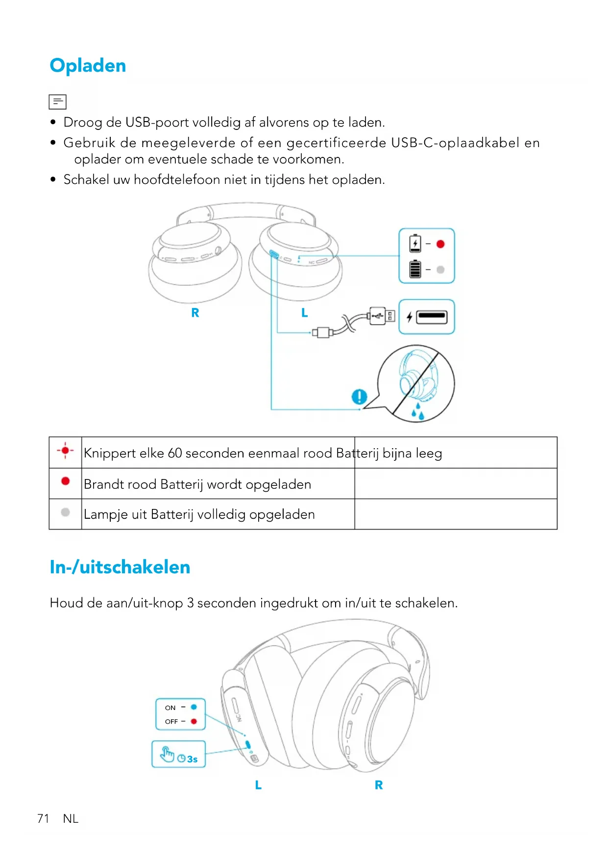 - Schakel uw hoofdtelefoon niet in tijdens het opladen. R L Knippert elke 60 seconden eenmaal rood Batterij bijna leeg Brandt rood Batterij wordt opgeladen Lampje uit Batterij volledig opgeladen In-/uitschakelen Houd de aan/uit-knop 3 seconden ingedrukt om in/uit te schakelen.