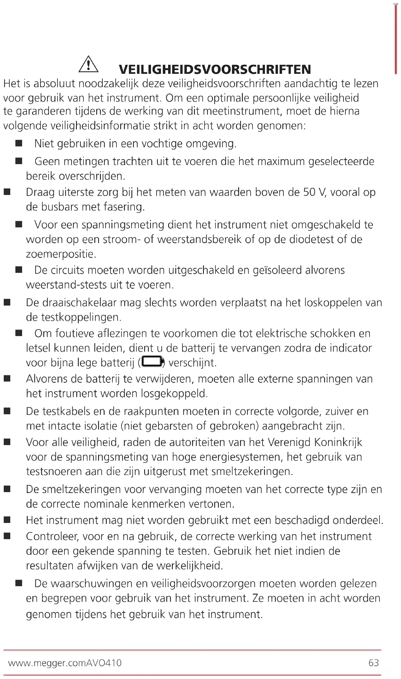 G VEILIGHEIDSVOORSCHRIFTEN Het is absoluut noodzakelijk deze veiligheidsvoorschriften aandachtig te lezen voor gebruik van het instrument. Om een optimale persoonlijke veiligheid te garanderen tijdens de werking van dit meetinstrument, moet de hierna volgende veiligheidsinformatie strikt in acht worden genomen: n Niet gebruiken in een vochtige omgeving. n Geen metingen trachten uit te voeren die het maximum geselecteerde bereik overschrijden. n Draag uiterste zorg bij het meten van waarden boven de 50 V, vooral op de busbars met fasering. n Voor een spanningsmeting dient het instrument niet omgeschakeld te worden op een stroom- of weerstandsbereik of op de diodetest of de zoemerpositie. n De circuits moeten worden uitgeschakeld en geïsoleerd alvorens weerstand-stests uit te voeren. n De draaischakelaar mag slechts worden verplaatst na het loskoppelen van de testkoppelingen. n Om foutieve aflezingen te voorkomen die tot elektrische schokken en letsel kunnen leiden, dient u de batterij te vervangen zodra de indicator voor bijna lege batterij ( ) verschijnt. n Alvorens de batterij te verwijderen, moeten alle externe spanningen van het instrument worden losgekoppeld. n De testkabels en de raakpunten moeten in correcte volgorde, zuiver en met intacte isolatie (niet gebarsten of gebroken) aangebracht zijn. n Voor alle veiligheid, raden de autoriteiten van het Verenigd Koninkrijk voor de spanningsmeting van hoge energiesystemen, het gebruik van testsnoeren aan die zijn uitgerust met smeltzekeringen. n De smeltzekeringen voor vervanging moeten van het correcte type zijn en de correcte nominale kenmerken vertonen. n Het instrument mag niet worden gebruikt met een beschadigd onderdeel. n Controleer, voor en na gebruik, de correcte werking van het instrument door een gekende spanning te testen. Gebruik het niet indien de resultaten afwijken van de werkelijkheid. n De waarschuwingen en veiligheidsvoorzorgen moeten worden gelezen en begrepen voor gebruik van het instrument. Ze moeten in acht worden genomen tijdens het gebruik van het instrument.www.megger.com AVO410