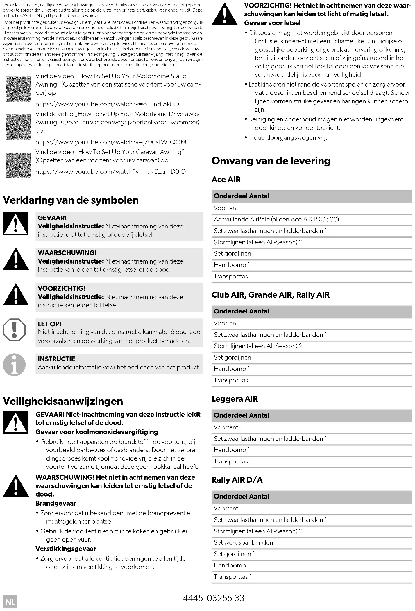 https://www.youtube.com/watch?v=jZ00sLWLQQM Vind de video „How To Set Up Your Caravan Awning” (Opzetten van een voortent voor uw caravan) op https://www.youtube.com/watch?v=hokC_gmD0lQ GEVAAR! Veiligheidsinstructie: Niet-inachtneming van deze instructie leidt tot ernstig of dodelijk letsel. WAARSCHUWING! Veiligheidsinstructie: Niet-inachtneming van deze instructie kan leiden tot ernstig letsel of de dood. VOORZICHTIG! Veiligheidsinstructie: Niet-inachtneming van deze instructie kan leiden tot letsel. LET OP! Niet-inachtneming van deze instructie kan materiële schade veroorzaken en de werking van het product benadelen. INSTRUCTIE Aanvullende informatie voor het bedienen van het product. Onderdeel Aantal Voortent 1 Aanvullende AirPole (alleen Ace AIR PRO500) 1 Set zwaarlastharingen en ladderbanden 1 Stormlijnen (alleen All-Season) 2 Set gordijnen 1 Handpomp 1 Transporttas 1 Onderdeel Aantal Voortent 1 Set zwaarlastharingen en ladderbanden 1 Stormlijnen (alleen All-Season) 2 Set gordijnen 1 Handpomp 1 Transporttas 1 Onderdeel Aantal Voortent 1 Set zwaarlastharingen en ladderbanden 1 Handpomp 1 Transporttas 1 Onderdeel Aantal Voortent 1 Set zwaarlastharingen en ladderbanden 1 Stormlijnen (alleen All-Season) 2 Set werpspanbanden 1 Set gordijnen 1 Handpomp 1 Transporttas 1NL