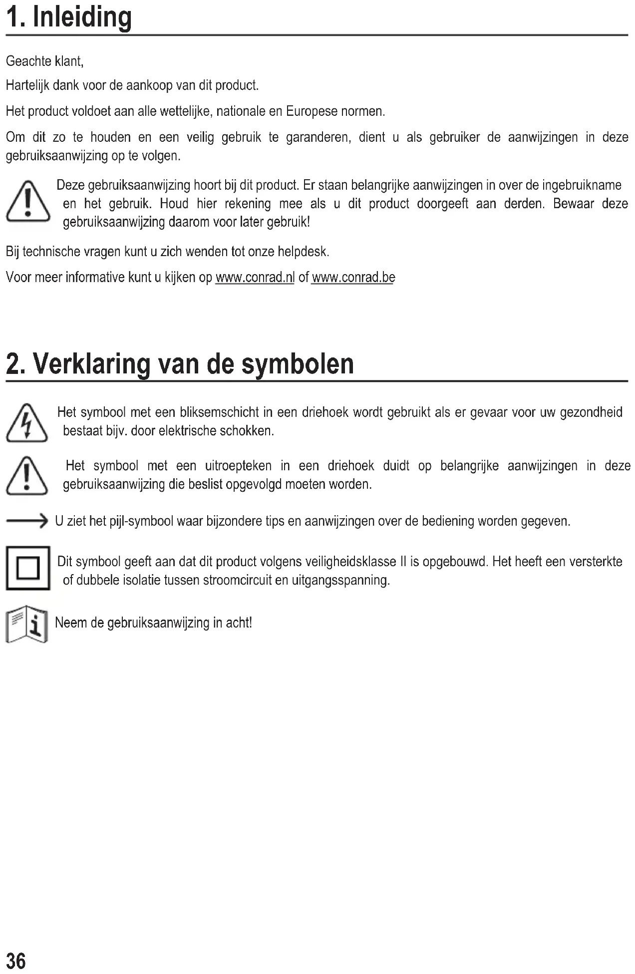 Geachte klant, Hartelijk dank voor de aankoop van dit product. Het product voldoet aan alle wettelijke, nationale en Europese normen. Om dit zo te houden en een veilig gebruik te garanderen, dient u als gebruiker de aanwijzingen in deze gebruiksaanwijzing op te volgen. Deze gebruiksaanwijzing hoort bij dit product. Er staan belangrijke aanwijzingen in over de ingebruikname en het gebruik. Houd hier rekening mee als u dit product doorgeeft aan derden. Bewaar deze gebruiksaanwijzing daarom voor later gebruik! Bij technische vragen kunt u zich wenden tot onze helpdesk. Voor meer informative kunt u kijken op www.conrad.nl of www.conrad.be