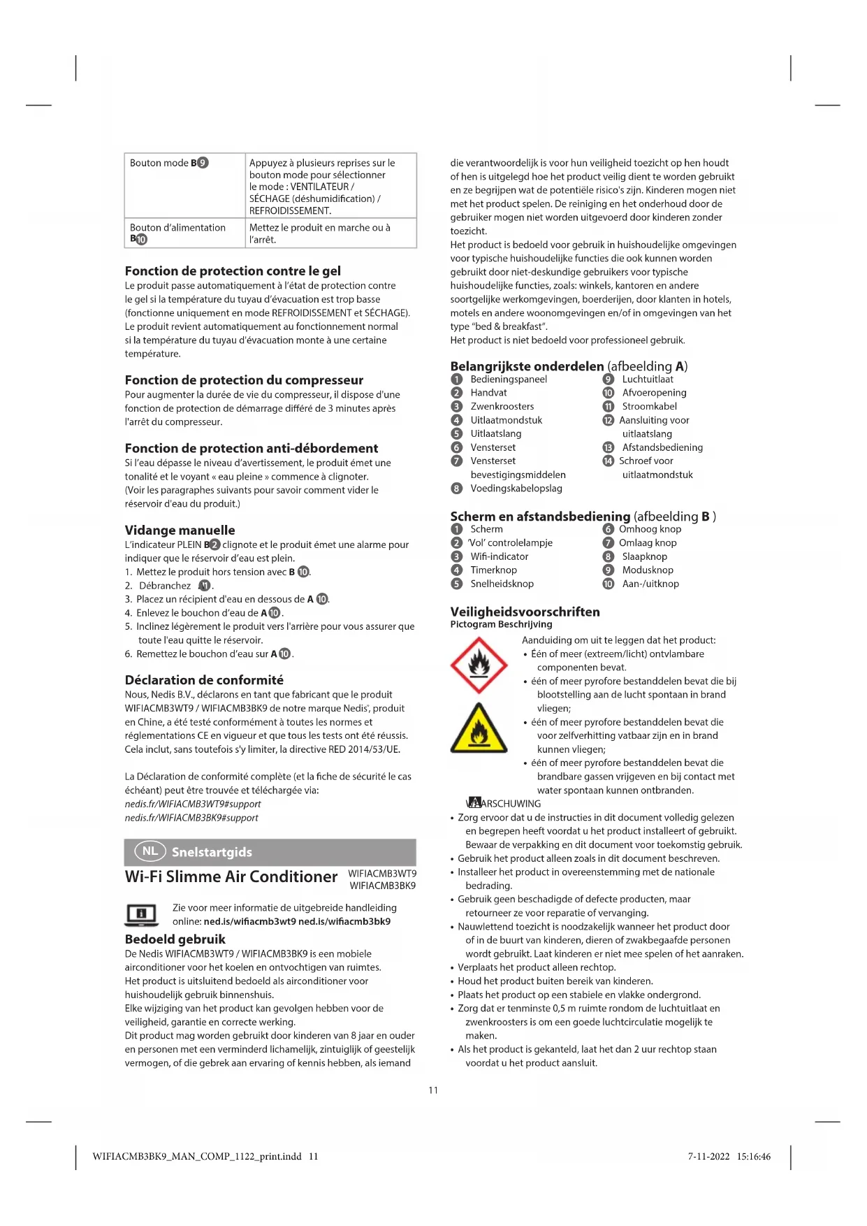 Snelstartgids Wi-Fi Slimme Air Conditioner WIFIACMB3WT9 WIFIACMB3BK9Zie voor meer informatie de uitgebreide handleiding online: ned.is/wiacmb3wt9 ned.is/wiacmb3bk9 Bedoeld gebruik De Nedis WIFIACMB3WT9 / WIFIACMB3BK9 is een mobiele airconditioner voor het koelen en ontvochtigen van ruimtes.Het product is uitsluitend bedoeld als airconditioner voor huishoudelijk gebruik binnenshuis.Elke wijziging van het product kan gevolgen hebben voor de veiligheid, garantie en correcte werking.Dit product mag worden gebruikt door kinderen van 8 jaar en ouder en personen met een verminderd lichamelijk, zintuiglijk of geestelijk vermogen, of die gebrek aan ervaring of kennis hebben, als iemand WIFIACMB3BK9_MAN_COMP_1122_print.indd 11WIFIACMB3BK9_MAN_COMP_1122_print.indd 11 7-11-2022 15:16:467-11-2022 15:16:4612 elektrische kachels, fornuizen of andere ontstekingsbronnen wordt voorkomen.