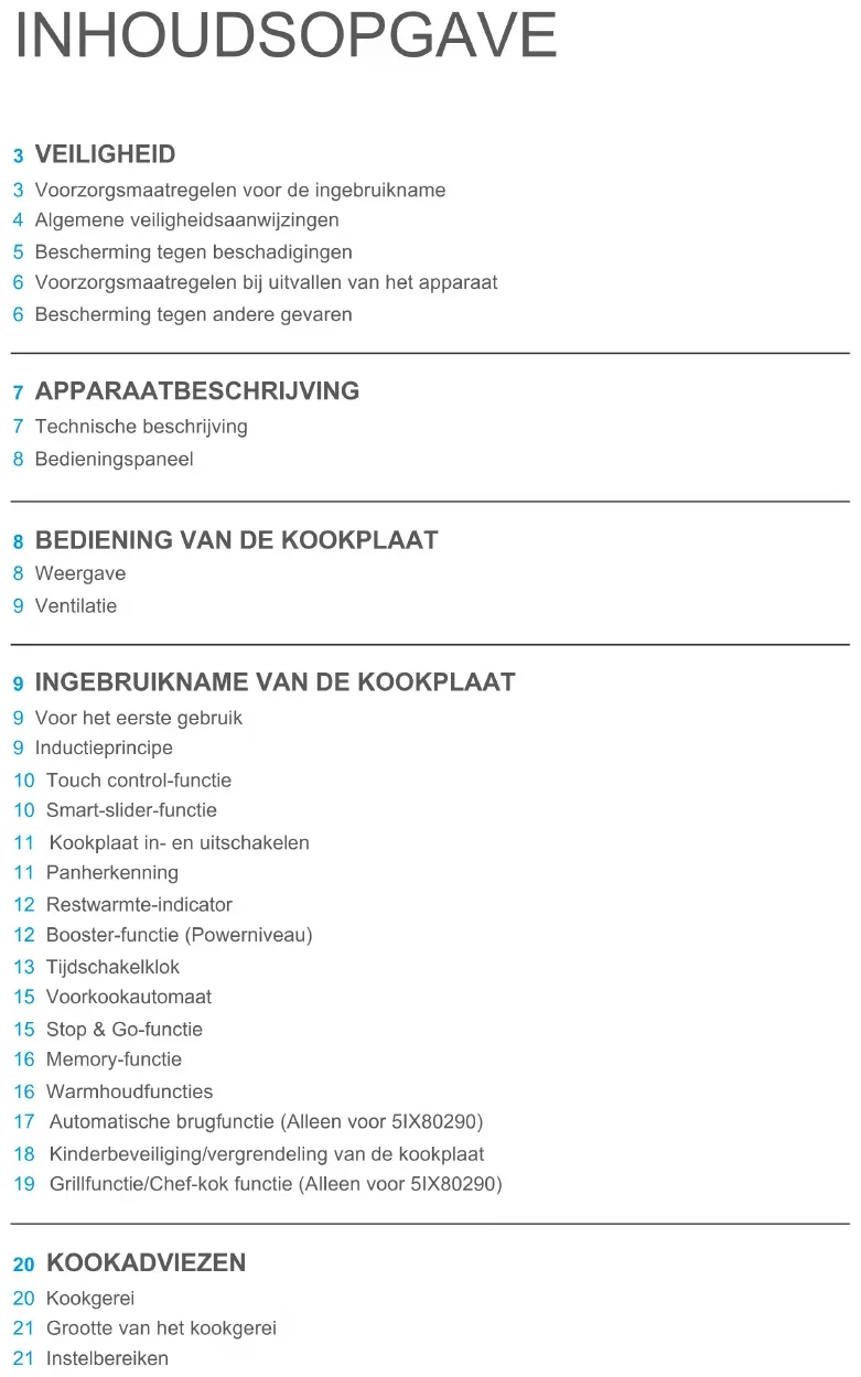 9 Voor het eerste gebruik 9 Inductieprincipe 10 Touch control-functie 10 Smart-slider-functie 11 Kookplaat in- en uitschakelen 11 Panherkenning 12 Restwarmte-indicator 12 Booster-functie (Powerniveau) 13 Tijdschakelklok 15 Voorkookautomaat 15 Stop & Go-functie 16 Memory-functie 16 Warmhoudfuncties 17 Automatische brugfunctie (Alleen voor 5IX80290) 18 Kinderbeveiliging/vergrendeling van de kookplaat 19 Grillfunctie/Chef-kok functie (Alleen voor 5IX80290) 20 KOOKADVIEZEN 20 Kookgerei 21 Grootte van het kookgerei 21 Instelbereiken22 INGEBRUIKNAME VAN DE KAP (NIET VOOR 5IZ34291) 22 Eerste stappen 22 Booster Functie 22 Timer Functie 23 Automatische Functie