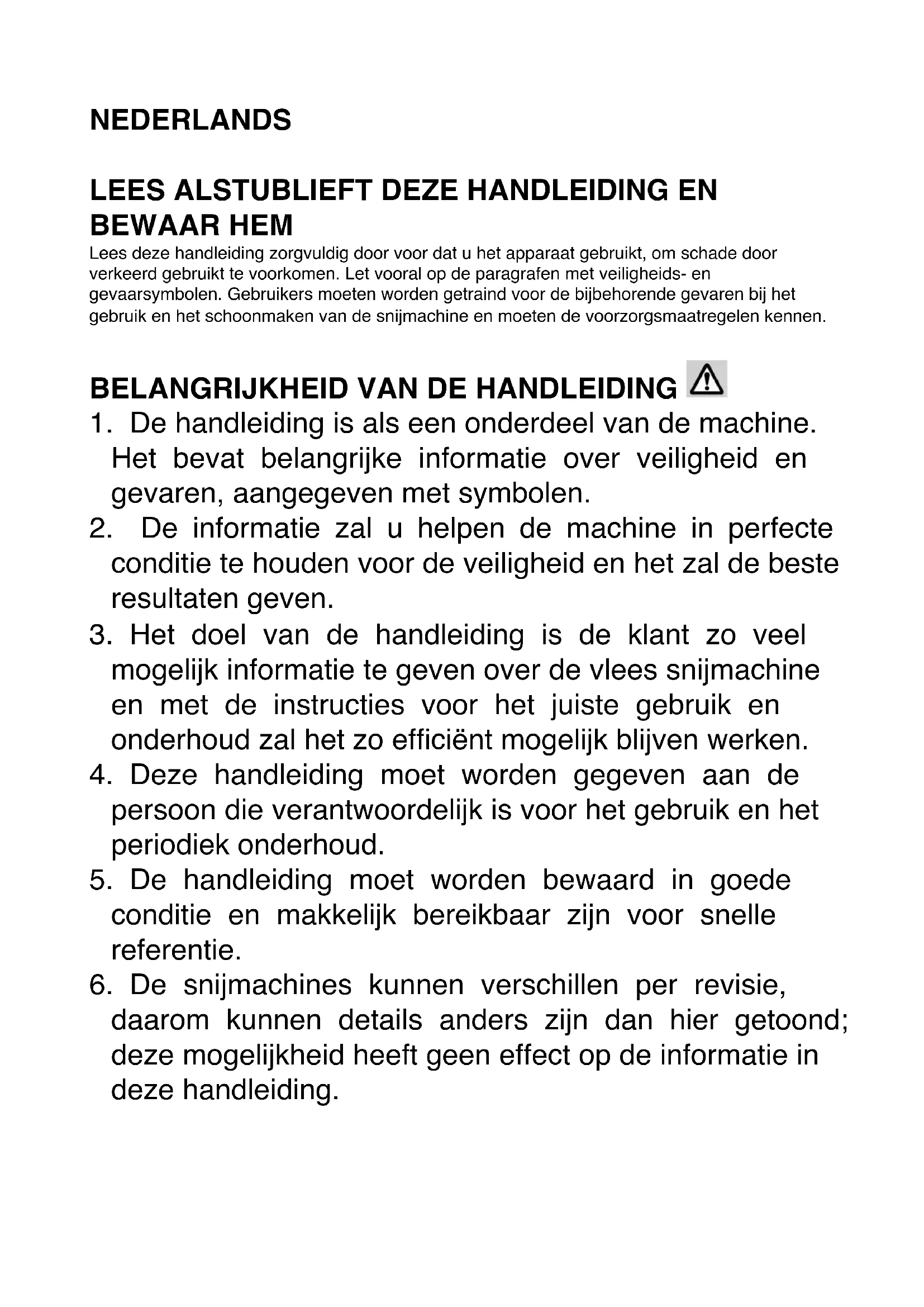 BEWAAR HEM Lees deze handleiding zorgvuldig door voor dat u het apparaat gebruikt, om schade door verkeerd gebruikt te voorkomen. Let vooral op de paragrafen met veiligheids- en gevaarsymbolen. Gebruikers moeten worden getraind voor de bijbehorende gevaren bij het gebruik en het schoonmaken van de snijmachine en moeten de voorzorgsmaatregelen kennen.