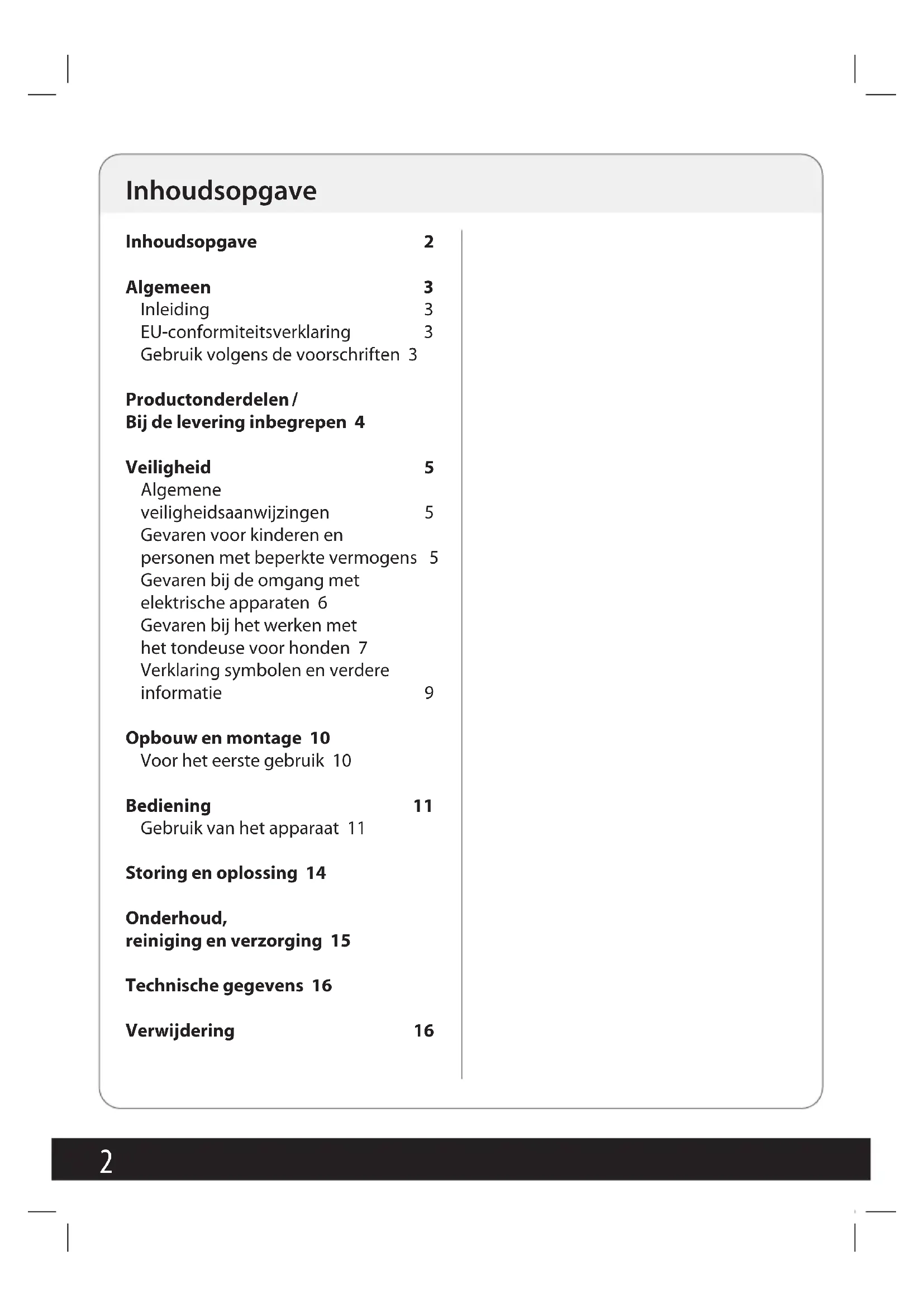 J) Opzetkam 12 mm K) Opzetkam rechts schuin aflopend L) Opzetkam links schuin aflopend M) Kam N) Schaar O) Reinigingkwastje P) Vachtborstel Q) Opbergtas R) Opbergbox (zonder afb.) S) Gebruiksaanwijzing en garantiekaart (zonder afb.) Technische en optische wijzigingen voorbehouden. Productonderdelen / Bij de levering inbegrepen5 Veiligheid Lees alle onderstaande veiligheidsaanwijzingen zorgvuldig en neem deze in acht. Bij het niet in acht nemen bestaat er gevaar voor ernstige ongelukken en verwon- dingen en het risico voor materiële schade en schade aan het apparaat. Algemene veiligheidsaanwijzingen Gevaren voor kinderen en personen met beperkte vermogens - Dit apparaat kan gebruikt worden door kinderen van 8 jaar en ouder en door personen met beperkte fysieke, sensorische of men- tale vermogens of gebrek aan ervaring en/of kennis, als ze onder toezicht staan of geïnstrueerd werden over het veilige gebruik van het apparaat en de eventu- eel daaruit voortkomende gevaren begrepen hebben. - Tondeuses voor dieren mogen door kinderen vanaf 3 jaar onder toe- zicht worden gebruikt. - Scheerapparaten voor dieren mogen alleen door geïnstrueerde personen worden gebruikt. - De reiniging en het onder- houd door de gebruiker mogen niet uitgevoerd worden door kinderen. Het apparaat en zijn aansluit- snoer moeten bij kinderen jonger dan 8 jaar uit de buurt gehouden worden. - Kinderen mogen niet met het apparaat spelen. Kinde- ren herkennen het gevaar niet dat ontstaan kan bij het omgaan met elektri- sche apparaten. Gebruik en bewaar het apparaat daar- om buiten het bereik van kinderen jonger dan 8 jaar. Laat het snoer niet naar beneden hangen, zodat er niet aan getrokken kan worden. - Houd het verpakkingsmate-6 riaal buiten het bereik van kinderen – verstikkingsge- vaar! - Kleine onderdelen kun- nen levensgevaarlijk zijn als ze ingeslikt worden. Gevaren bij de omgang met elektrische apparaten - Sluit het apparaat alleen aan een volgens de voor- schriften geïnstalleerd, geaard stopcontact aan met een netspanning die overeenkomt met die op het typeplaatje. - Als het snoer beschadigd is, mag dit alleen vervangen worden door een door de fabrikant genoemd servi- cestation om gevaar voor letsel en ongevallen of schade aan het apparaat te voorkomen. - Let er op dat het stopcon- tact in de buurt van het apparaat zit en goed te bereiken is om in geval van storing direct de stekker van het apparaat uit het stopcontact te kunnen halen. - Reparaties mogen alleen uitgevoerd worden door er- kende servicestations. Niet deskundig gerepareerde apparaten zijn een gevaar voor de gebruiker. - Laat het apparaat niet zon- der toezicht als het aanstaat om ongevallen te voorko- men. - Om ongevallen te voorko- men, mogen er nooit meer- dere huishoudelijke appa- raten tegelijk op hetzelfde stopcontact aangesloten worden (bijv. met een 3-weg stekker). - Het apparaat nooit in water dompelen en niet buiten gebruiken, omdat het niet blootgesteld mag worden aan regen of ander vocht! - Gevaar voor een elektri- sche schok! - Als het apparaat toch in het water gevallen is, trek dan eerst de stekker er uit en haal dan het apparaat uit het water! Gebruik het apparaat daarna niet meer, maar laat het eerst con-7 troleren door een erkend servicestation. Dit geldt ook voor als het netsnoer of het apparaat beschadigd is of als het apparaat gevallen is. Gevaar voor een elektri- sche schok! - Trek altijd de stekker uit het stopcontact, als u het apparaat niet gebruikt en voor iedere reiniging of bij storingen! Trek nooit aan het snoer! Gevaar voor een elektrische schok! - Zorg er voor dat het snoer of het apparaat nooit op een heet oppervlak of in de buurt van warmtebron- nen gelegd of gezet wordt. Leg het snoer zo neer dat het niet in contact komt met hete of scherpe voor- werpen. Gevaar voor een elektrische schok! - Knik in geen geval het snoer en wikkel het niet om het apparaat want dit kan leiden tot een breuk in het snoer. Gevaar voor een elektrische schok! - Gebruik het apparaat niet, als u op een natte onder- grond staat of als uw han- den of het apparaat nat zijn. Gevaar voor een elektri- sche schok! - Open het apparaat nooit zelf en probeer niet om met metalen voorwerpen binnen in het apparaat te komen. Gevaar voor een elektrische schok! Gevaren bij het werken met het tondeuse voor honden - Sluit de haartondeuse alleen aan op een netspanning volgens het typeplaatje. - Gebruik de haartondeu- se niet in de buurt van het bad, de wasbak of andere bakken, waar water in zit, want de nabijheid van wa- ter vormt een gevaar. - Gebruik geen andere dan de meegeleverde opzet- kammen. Gebruik geen kapotte opzetkammen en geen kapotte scheerkop. - Druk niet op de messen en raak deze niet aan met harde voorwerpen om bescha- digingen te voorkomen.8 - Trim geen nat haar/natte vacht met de haartondeuse. Hij is uitsluitend bestemd voor het gebruik op droog haar. - Gebruik de haartondeu- se niet op een gewonde huid of bij huidziekten. - Gebruik het apparaat uitslui- tend voor het trimmen van dierenhaar, in geen geval voor andere doeleinden. Het apparaat is niet geschikt voor het scheren van dieren. - Gebruik alleen originele accessoires! Als er geen originele accessoires gebruikt worden, moet er rekening gehouden worden met een verhoogd gevaar voor on- gelukken. Bij ongevallen of schade met niet originele accessoires vervalt elke aan- spraak. Bij het gebruik van vreemde accessoires en de daaruit voortkomende scha- de aan het apparaat vervalt elke aanspraak op garantie. - Let er op dat er geen olie- druppels op de scheer- kop zitten, voordat u het apparaat gebruikt. - Controleer voor ieder ge- bruik of het apparaat of de accessoires beschadigd zijn. Gevaar voor verwondingen! - Voor het reinigen en het onderhoud evenals voor het er opzetten of er afha- len van accessoires moet het apparaat altijd uitgezet en de stekker uit het stop- contact gehaald worden. - Zorg er voor dat het appa- raat uitgezet is, voordat u de stekker in het stopcon- tact doet of e