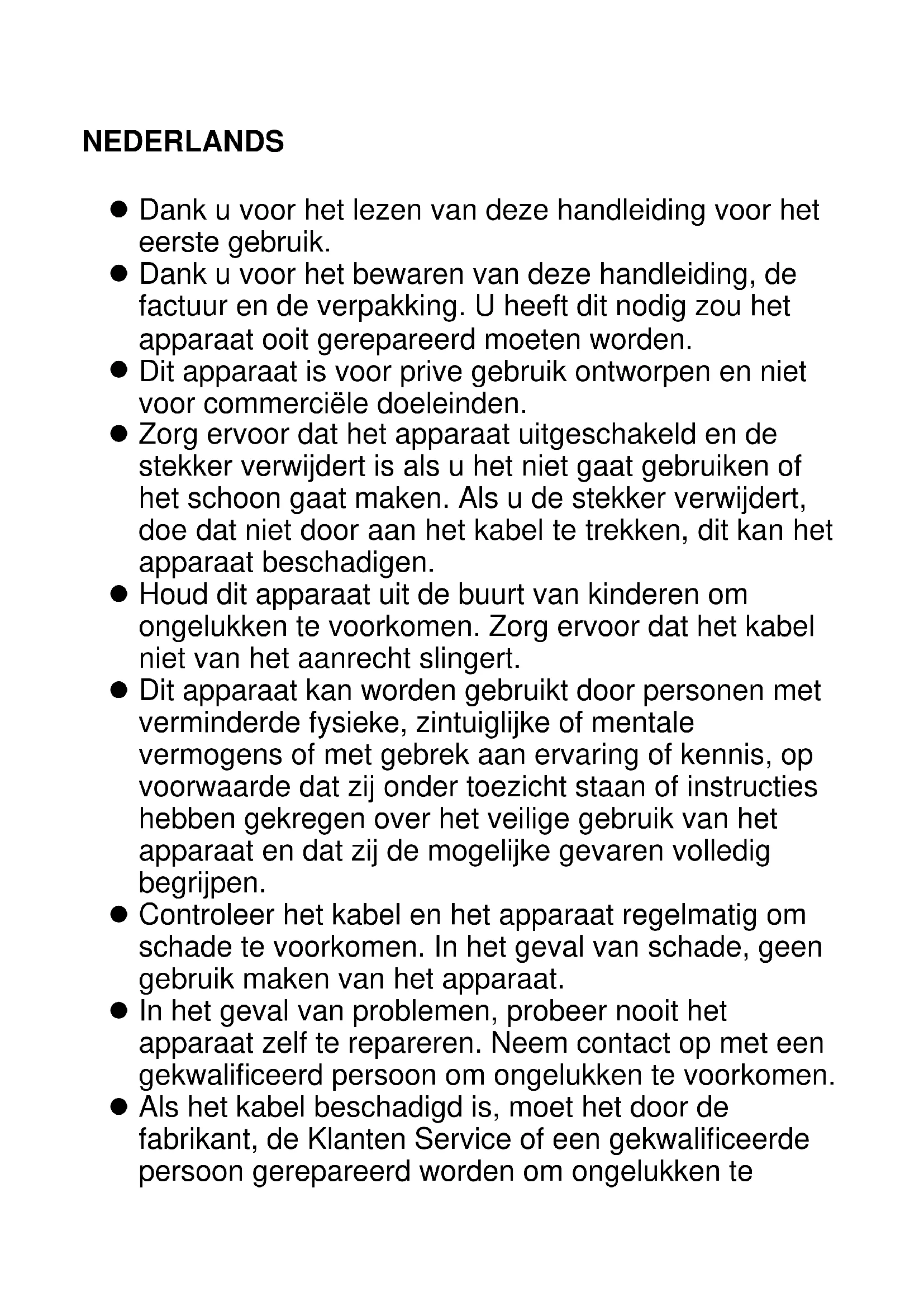 Als het kabel beschadigd is, moet het door de fabrikant, de Klanten Service of een gekwalificeerde persoon gerepareerd worden om ongelukken tevermijden.