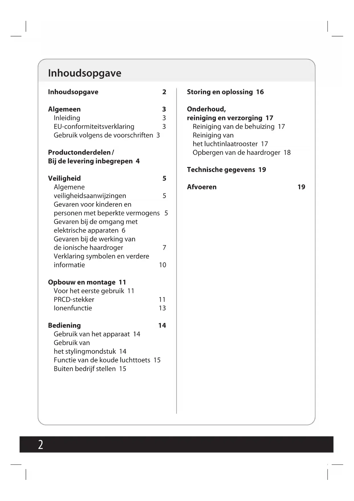 Inhoudsopgave 2 Algemeen 3 Inleiding 3 EU-conformiteitsverklaring 3 Gebruik volgens de voorschriften 3 Productonderdelen / Bij de levering inbegrepen 4 Veiligheid 5 Algemene veiligheidsaanwijzingen 5 Gevaren voor kinderen en personen met beperkte vermogens 5 Gevaren bij de omgang met elektrische apparaten 6 Gevaren bij de werking van de ionische haardroger 7 Verklaring symbolen en verdere informatie 10 Opbouw en montage 11 Voor het eerste gebruik 11 PRCD-stekker 11 Ionenfunctie 13 Bediening 14 Gebruik van het apparaat 14 Gebruik van het stylingmondstuk 14 Functie van de koude luchttoets 15 Buiten bedrijf stellen 15 Storing en oplossing 16 Onderhoud, reiniging en verzorging 17 Reiniging van de behuizing 17 Reiniging van het luchtinlaatrooster 17 Opbergen van de haardroger 18 Technische gegevens 19 Afvoeren 19 Inhoudsopgave3