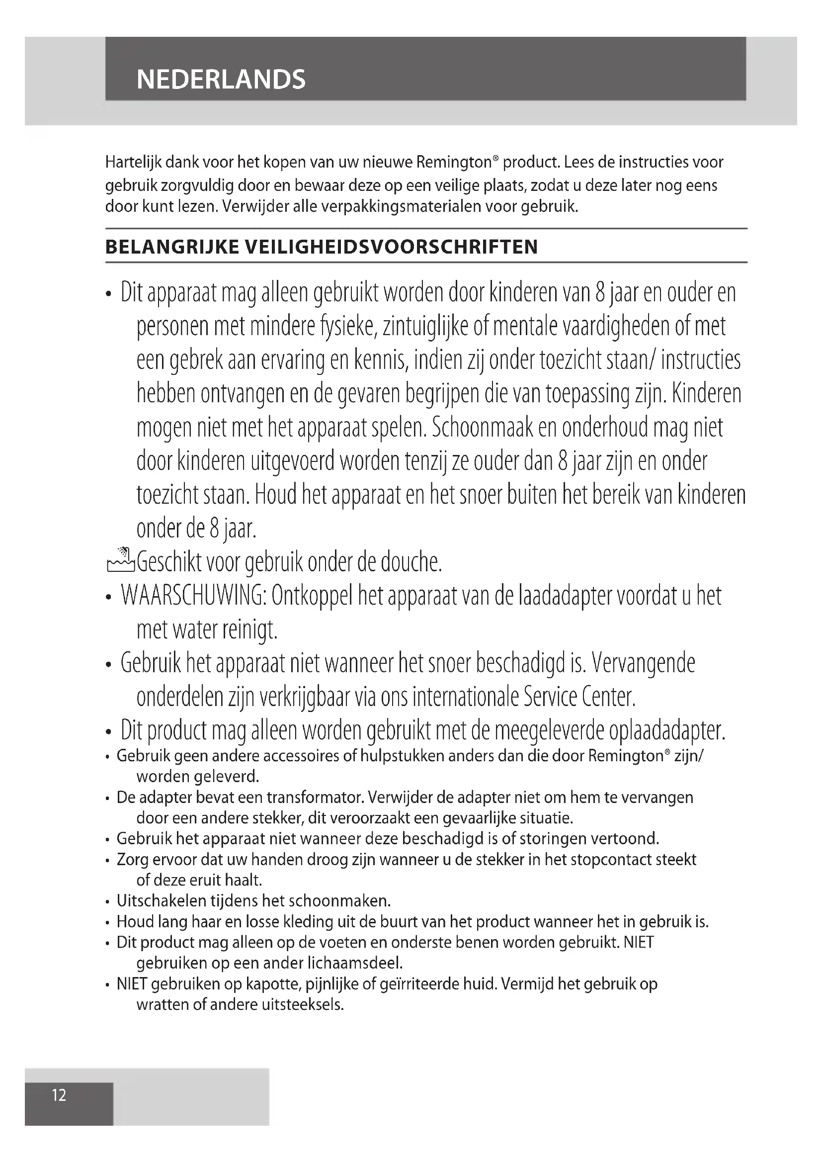 - Gebruik geen andere accessoires of hulpstukken anders dan die door Remington® zijn/ worden geleverd.