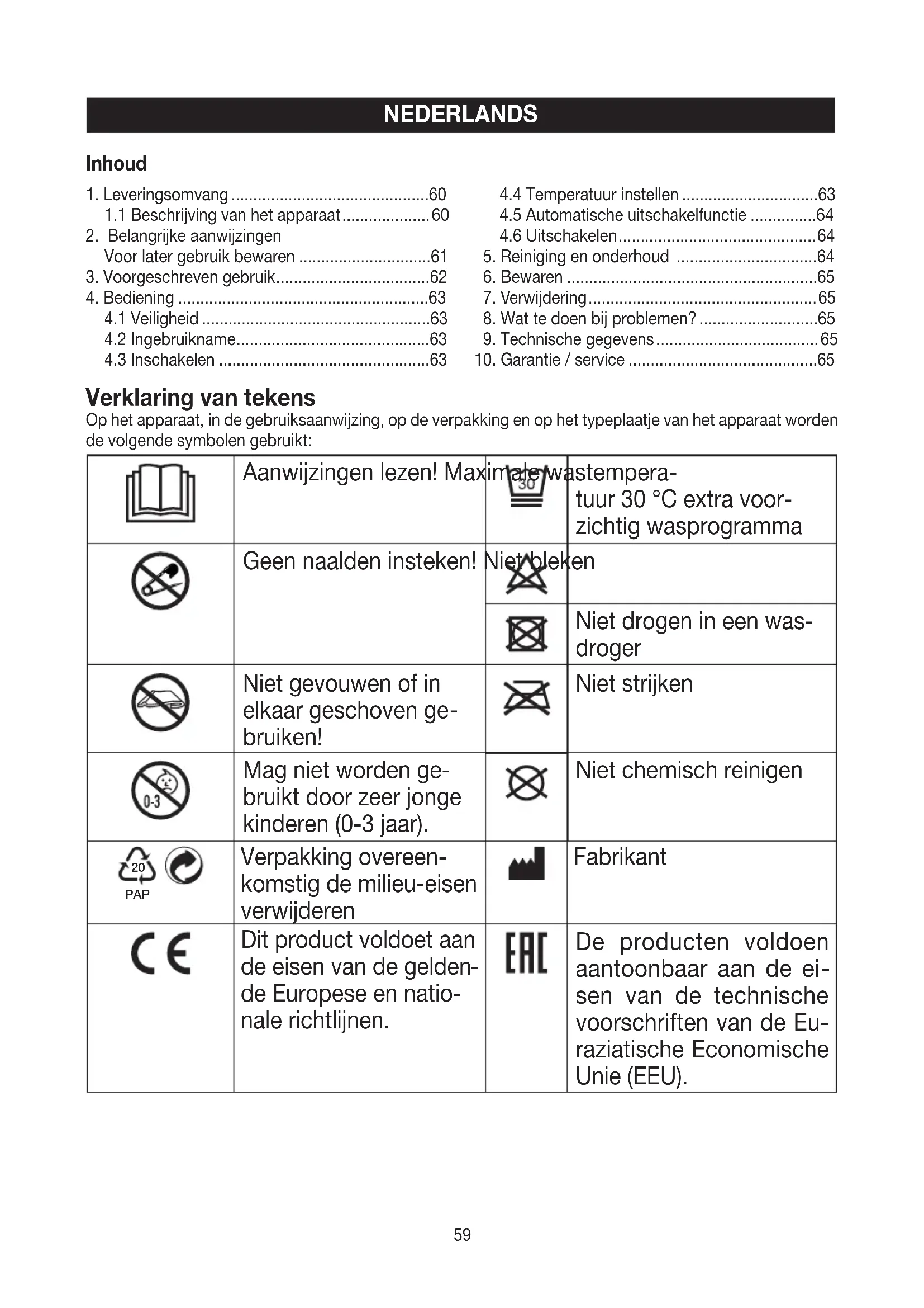 Inhoud60 Het apparaat is dubbel geïsoleerd en voldoet derhalve aan veilig