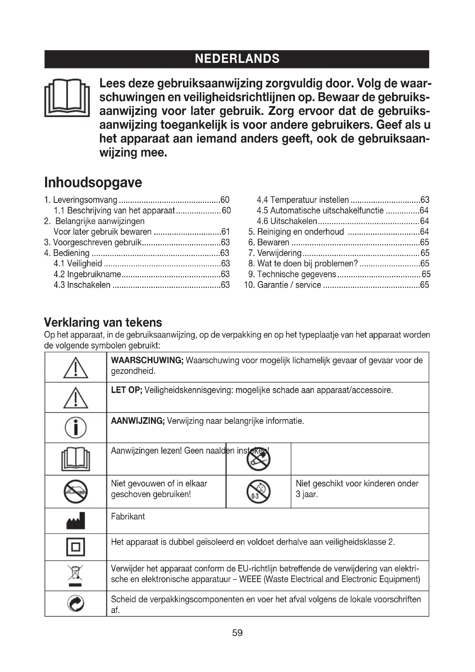 Szczegółowe informacje na temat gwarancji i warunków gwarancji znajdują się w załączonej ulotce gwa- rancyjnej. Zastrzega się prawo do pomyłek i zmian59 Verklaring van tekens Op het apparaat, in de gebruiksaanwijzing, op de verpakking en op het typeplaatje van het apparaat worden de volgende symbolen gebruikt: WAARSCHUWING; Waarschuwing voor mogelijk lichamelijk gevaar of gevaar voor de gezondheid. LET OP; Veiligheidskennisgeving: mogelijke schade aan apparaat/accessoire. AANWIJZING; Verwijzing naar belangrijke informatie. Aanwijzingen lezen! Geen naalden insteken! Niet gevouwen of in elkaar geschoven gebruiken! Niet geschikt voor kinderen onder 3jaar. Fabrikant Het apparaat is dubbel geïsoleerd en voldoet derhalve aan veiligheidsklasse 2. Verwijder het apparaat conform de EU-richtlijn betreende de verwijdering van elektri- sche en elektronische apparatuur – WEEE (Waste Electrical and Electronic Equipment) Scheid de verpakkingscomponenten en voer het afval volgens de lokale voorschriften af. NEDERLANDS Lees deze gebruiksaanwijzing zorgvuldig door. Volg de waar- schuwingen en veiligheidsrichtlijnen op. Bewaar de gebruiks- aanwijzing voor later gebruik. Zorg ervoor dat de gebruiks- aanwijzing toegankelijk is voor andere gebruikers. Geef als u het apparaat aan iemand anders geeft, ook de gebruiksaan