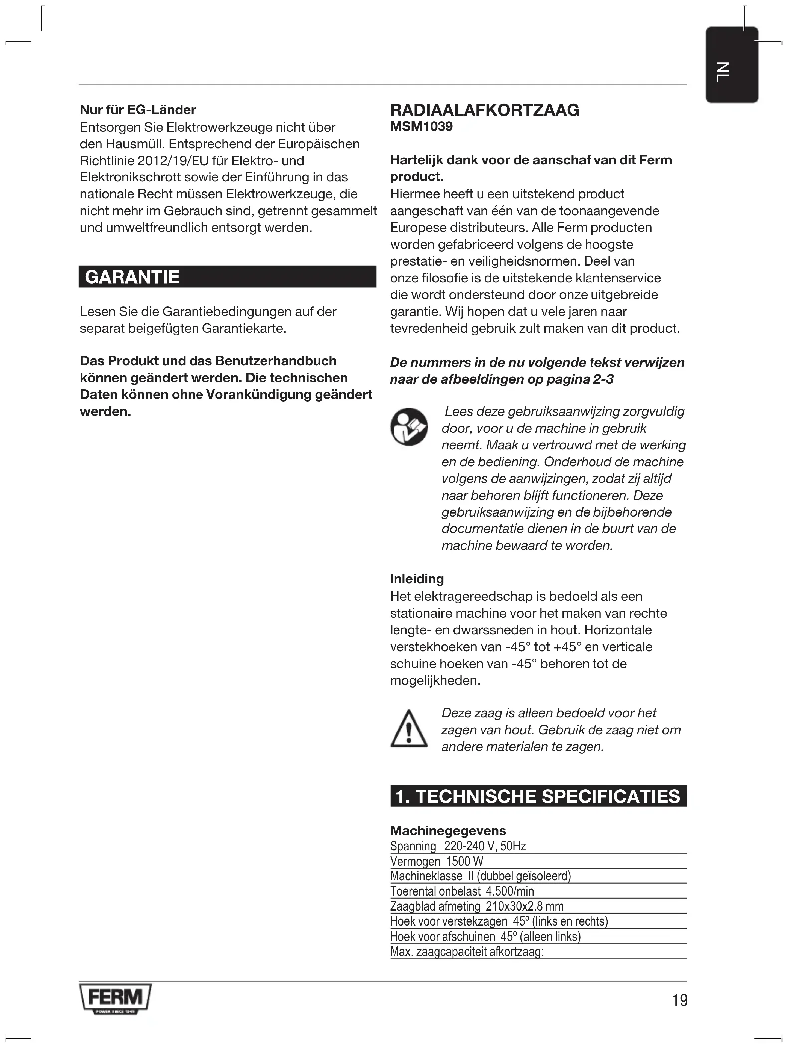 Nur für EG-Länder Entsorgen Sie Elektrowerkzeuge nicht über den Hausmüll. Entsprechend der Europäischen Richtlinie 2012/19/EU für Elektro- und Elektronikschrott sowie der Einführung in das nationale Recht müssen Elektrowerkzeuge, die nicht mehr im Gebrauch sind, getrennt gesammelt und umweltfreundlich entsorgt werden. GARANTIE Lesen Sie die Garantiebedingungen auf der separat beigefügten Garantiekarte. Das Produkt und das Benutzerhandbuch können geändert werden. Die technischen Daten können ohne Vorankündigung geändert werden. RADIAALAFKORTZAAG MSM1039 Hartelijk dank voor de aanschaf van dit Ferm product. Hiermee heeft u een uitstekend product aangeschaft van één van de toonaangevende Europese distributeurs. Alle Ferm producten worden gefabriceerd volgens de hoogste prestatie- en veiligheidsnormen. Deel van onze filosofie is de uitstekende klantenservice die wordt ondersteund door onze uitgebreide garantie. Wij hopen dat u vele jaren naar tevredenheid gebruik zult maken van dit product. De nummers in de nu volgende tekst verwijzen naar de afbeeldingen op pagina 2-3 Lees deze gebruiksaanwijzing zorgvuldig door, voor u de machine in gebruik neemt. Maak u vertrouwd met de werking en de bediening. Onderhoud de machine volgens de aanwijzingen, zodat zij altijd naar behoren blijft functioneren. Deze gebruiksaanwijzing en de bijbehorende documentatie dienen in de buurt van de machine bewaard te worden. Inleiding Het elektragereedschap is bedoeld als een stationaire machine voor het maken van rechte lengte- en dwarssneden in hout. Horizontale verstekhoeken van -45° tot +45° en verticale schuine hoeken van -45° behoren tot de mogelijkheden. Deze zaag is alleen bedoeld voor het zagen van hout. Gebruik de zaag niet om andere materialen te zagen.