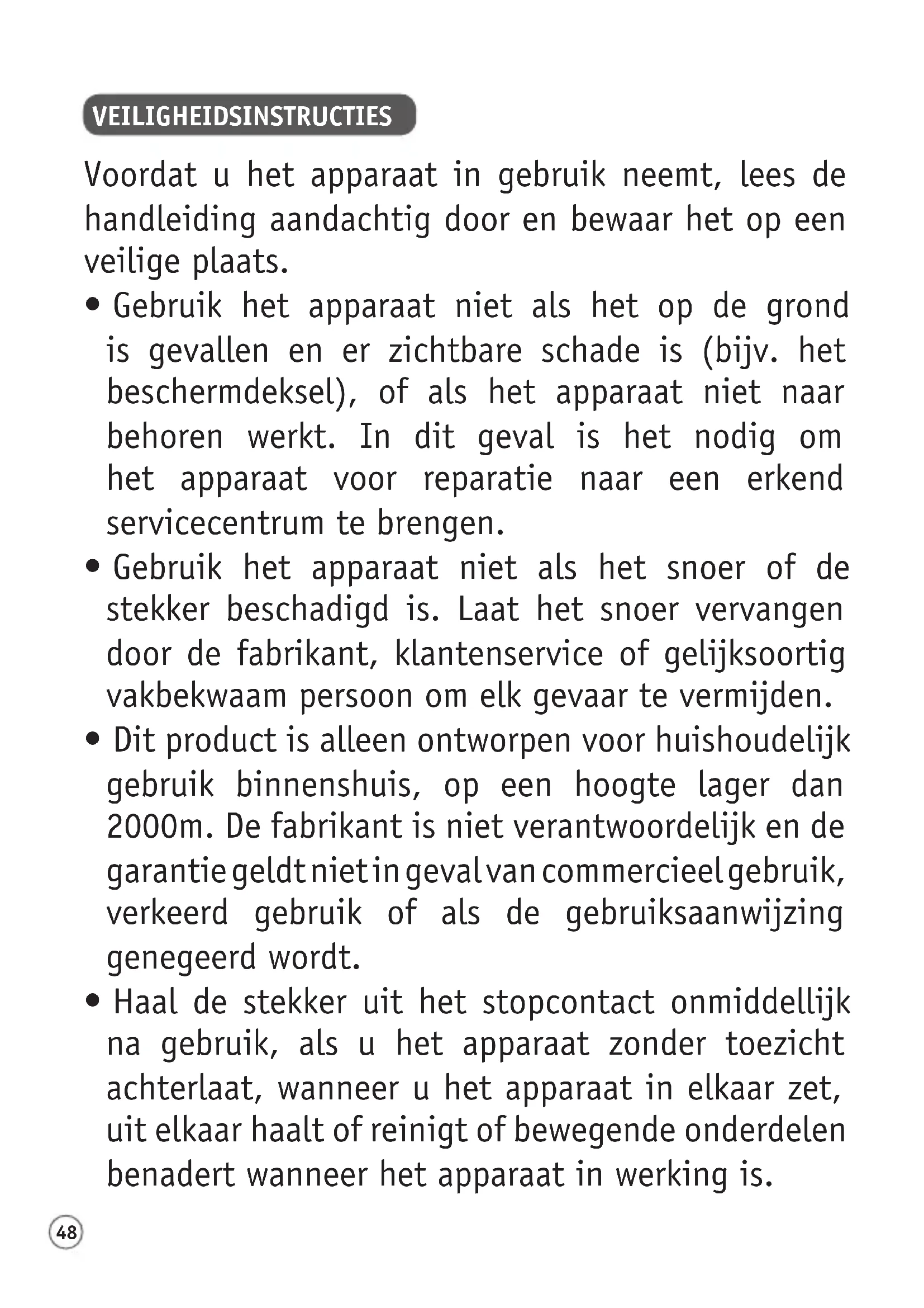 - Dit product is alleen ontworpen voor huishoudelijk gebruik binnenshuis, op een hoogte lager dan 2000m. De fabrikant is niet verantwoordelijk en de garantie geldt niet in geval van commercieel gebruik, verkeerd gebruik of als de gebruiksaanwijzing genegeerd wordt.