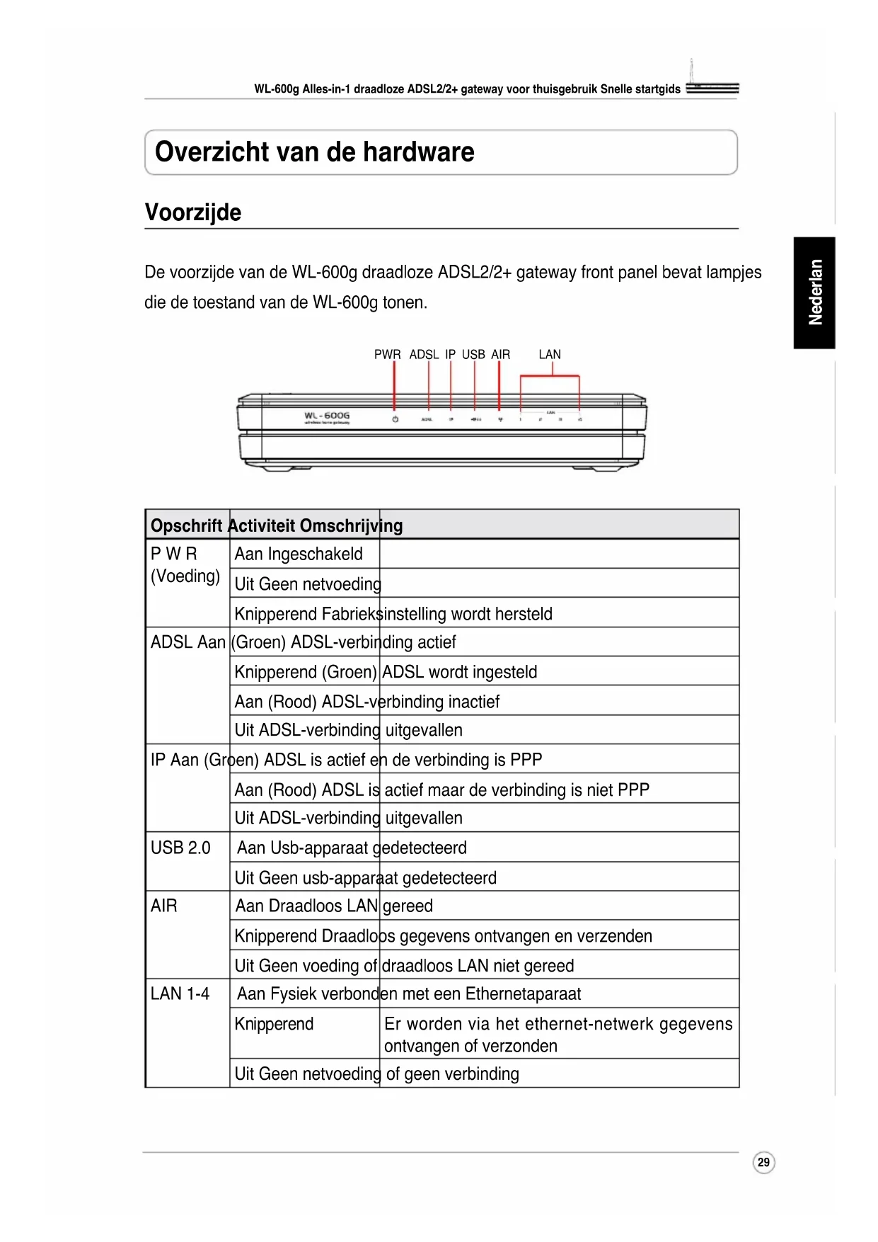 RomânăItalianoPortuguêsFrançais Overzicht van de hardware Voorzijde De voorzijde van de WL-600g draadloze ADSL2/2+ gateway front panel bevat lampjes die de toestand van de WL-600g tonen. Opschrift Activiteit Omschrijving P W R (Voeding) Aan Ingeschakeld Uit Geen netvoeding Knipperend Fabrieksinstelling wordt hersteld ADSL Aan (Groen) ADSL-verbinding actief Knipperend (Groen) ADSL wordt ingesteld Aan (Rood) ADSL-verbinding inactief Uit ADSL-verbinding uitgevallen IP Aan (Groen) ADSL is actief en de verbinding is PPP Aan (Rood) ADSL is actief maar de verbinding is niet PPP Uit ADSL-verbinding uitgevallen USB 2.0 Aan Usb-apparaat gedetecteerd Uit Geen usb-apparaat gedetecteerd AIR Aan Draadloos LAN gereed Knipperend Draadloos gegevens ontvangen en verzenden Uit Geen voeding of draadloos LAN niet gereed LAN 1-4 Aan Fysiek verbonden met een Ethernetaparaat Knipperend Er worden via het ethernet-netwerk gegevens ontvangen of verzonden Uit Geen netvoeding of geen verbinding PWR ADSL IP USB AIR LANWL-600g Alles-in-1 draadloze ADSL2/2+ gateway voor thuisgebruik Snelle startgids
