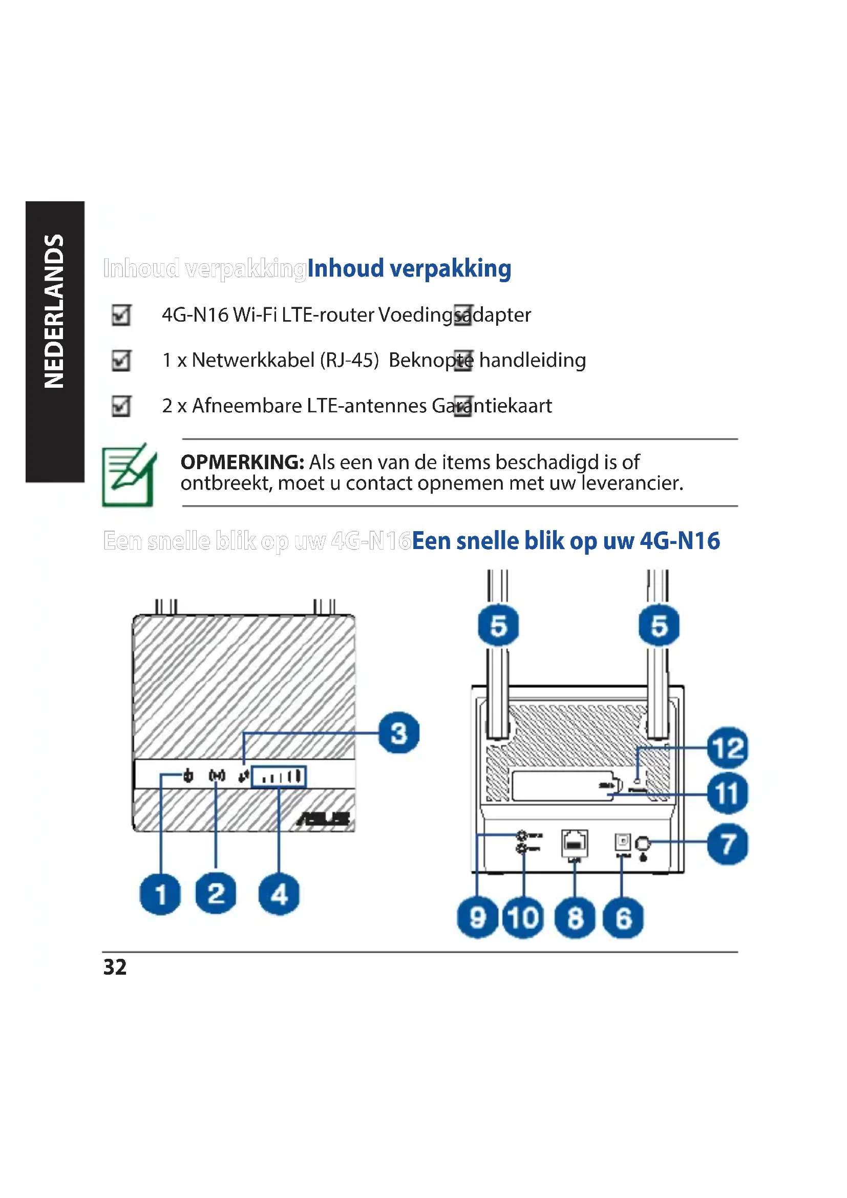 Betjeningsfugtighed ≤ 90% Opbevarings ≤ 95%32 NEDERLANDS OPMERKING: Als een van de items beschadigd is of ontbreekt, moet u contact opnemen met uw leverancier. Inhoud verpakkingInhoud verpakking 4G-N16 Wi-Fi LTE-router Voedingsadapter 1 x Netwerkkabel (RJ-45) Beknopte handleiding 2 x Afneembare LTE-antennes Garantiekaart Een snelle blik op uw 4G-N16Een snelle blik op uw 4G-N16 Nederlands33 NEDERLANDS