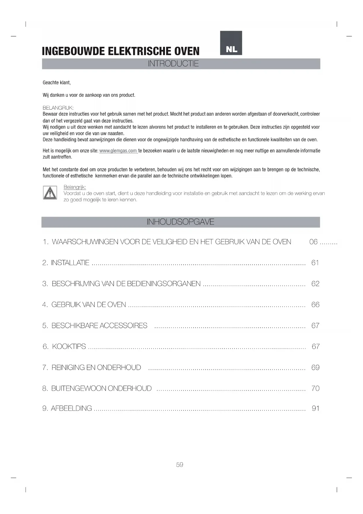 NOTAS PT59 Geachte klant, Wij danken u voor de aankoop van ons product. BELANGRIJK: Bewaar deze instructies voor het gebruik samen met het product. Mocht het product aan anderen worden afgestaan of doorverkocht, controleer dan of het vergezeld gaat van deze instructies. Wij nodigen u uit deze wenken met aandacht te lezen alvorens het product te installeren en te gebruiken. Deze instructies zijn opgesteld voor uw veiligheid en voor die van uw naasten. Deze handleiding bevat aanwijzingen die dienen voor de ongewijzigde handhaving van de esthetische en functionele kwaliteiten van de oven. Het is mogelijk om onze site: www.glemgas.com te bezoeken waarin u de laatste nieuwigheden en nog meer nuttige en aanvullende informatie zult aantreffen. Met het constante doel om onze producten te verbeteren, behouden wij ons het recht voor om wijzigingen aan te brengen op de technische, functionele of esthetische kenmerken ervan die parallel aan de technische ontwikkelingen lopen. Belangrijk: Voordat u de oven start, dient u deze handleiding voor installatie en gebruik met aandacht te lezen om de werking ervan zo goed mogelijk te leren kennen. INTRODUCTIE