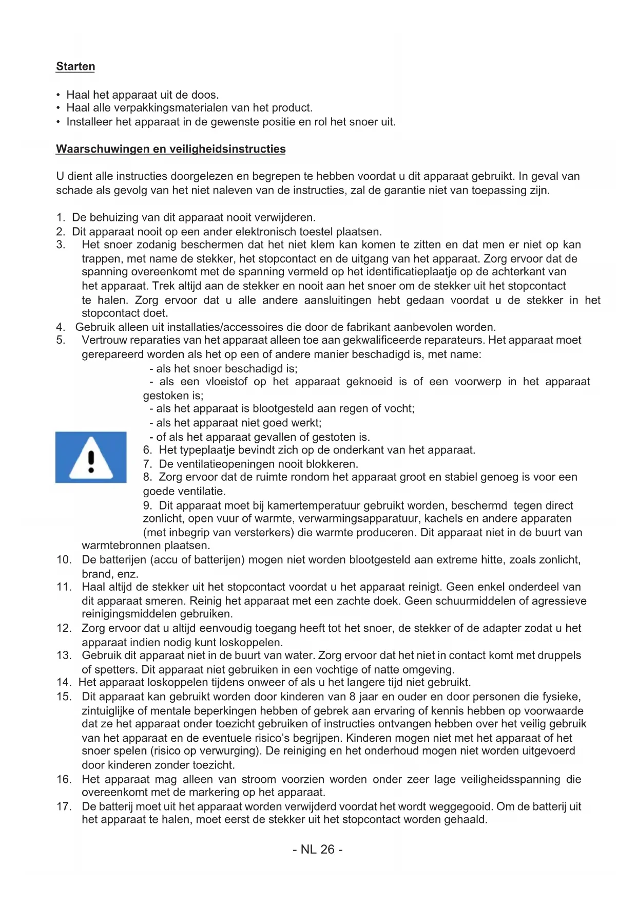 - Dit apparaat kan gebruikt worden door kinderen van 8aar en ouder en door personen die fysieke, zintuiglijke of mentale beperkingen hebben of gebrek aan ervaring of kennis hebben op voorwaarde dat ze het apparaat onder toezicht gebruiken of instructies ontvangen hebben over het veilig gebruik van het apparaat en de eventuele risico's begrijpen. Kinderen mogen Niet met het apparaat of het snoer spelen (risico op verwurging). De reiniging en het onderhoud mogen Niet worden uitgevoerd door kinderen zonder toezicht.