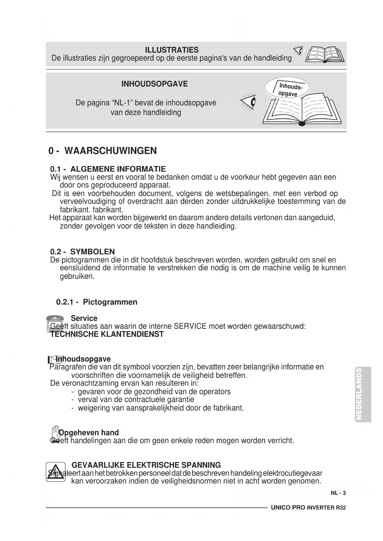 Signaleert aan het betrokken personeel dat de beschreven handeling elektrocutiegevaar kan veroorzaken indien de veiligheidsnormen niet in acht worden genomen. Inhouds- opgave INHOUDSOPGAVE De pagina “NL-1” bevat de inhoudsopgave van deze handleiding ILLUSTRATIES De illustraties zijn gegroepeerd op de eerste pagina's van de handleidingNL - 4 NEDERLANDS