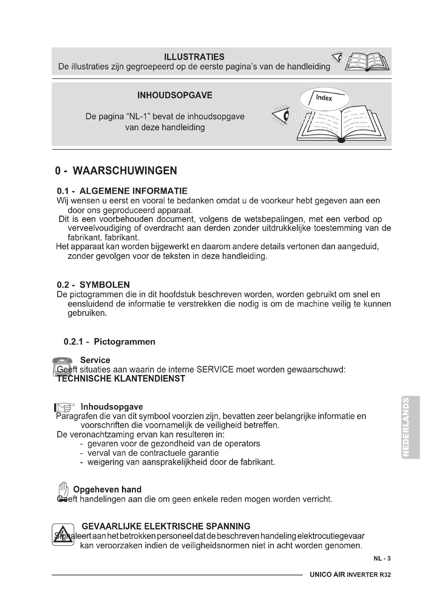 - Duidt aan dat er informatie in de gebruiksaanwijzing of installatiehandleiding beschikbaar is. OPGELET Duidt aan dat het servicepersoneel met het apparaat moet omgaan, in overeenstemming met de installatiehandleiding. QUANDO SI UTILIZZANO APPARECCHIATURE ELETTRICHE, È SEMPRE NECESSARIO SEGUIRE PRECAUZIONI DI SICUREZZA DI BASE PER RIDURRE RISCHI DI INCENDIO, SCOSSE ELETTRICHE E INFORTUNI A PERSONE, INCLUSO QUANTO SEGUE:UNICO AIR INVERTER R32 NL - 5 NEDERLANDS
