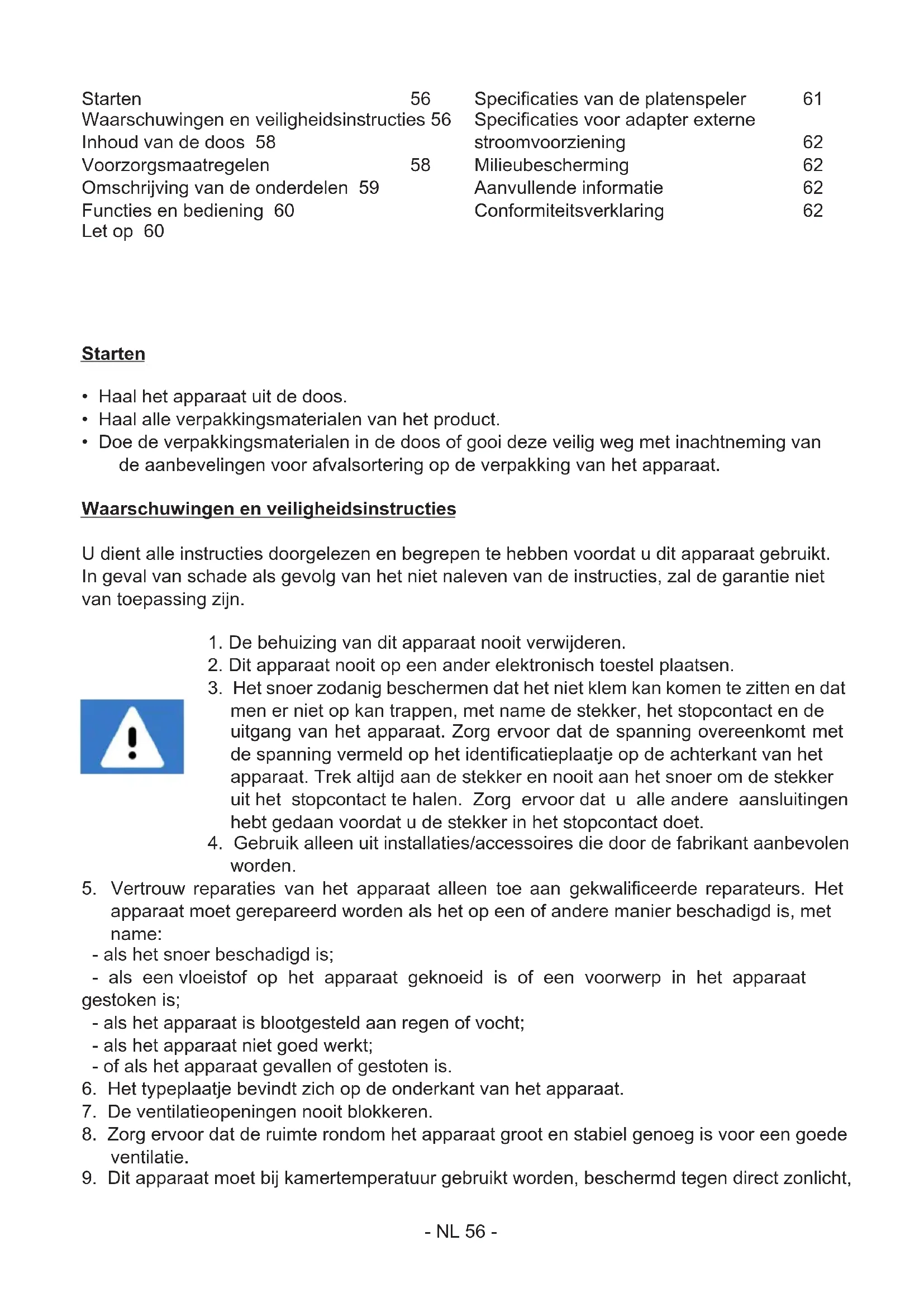 Starten 56 Waarschuwingen en veiligheidsinructies 56 Inhoud van de doos 58 Voorzorgsmaatregelen 58 Omschrijving van de onderdelen 59 Functies en bediening 60 Let op 60 Specicaties van de platenspeler 61 Specicaties voor adapter externe roomvoorziening 62 Milieubescherming 62 Aanvullende informatie 62 Conformiteitsverklaring 62- NL 57 - open vuur of warmte, verwarmingsapparatuur, kachels en andere apparaten (met inbegrip van vererkers) die warmte produceren. Dit apparaat niet in de buurt van warmtebronnen plaatsen.