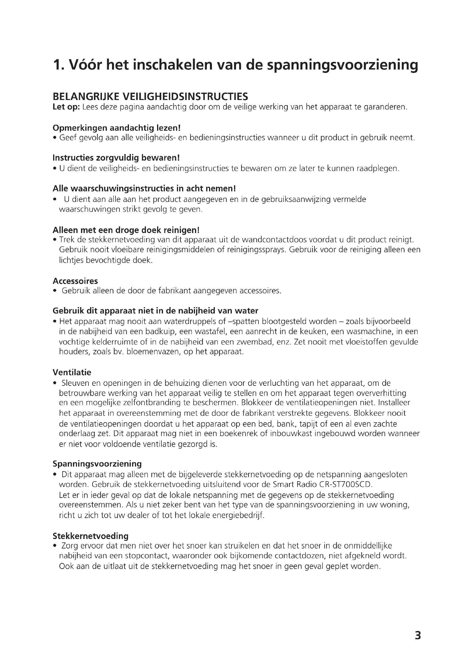 - Dit apparaat mag alleen met de bijgeleverde stekkernetvoeding op de netspanning aangesloten worden. Gebruik de stekkernetvoeding uitsluitend voor de Smart Radio CR-ST700SCD. Let er in ieder geval op dat de lokale netspanning met de gegevens op de stekkernetvoeding overeenstemmen. Als u niet zeker bent van het type van de spanningsvoorziening in uw woning, richt u zich tot uw dealer of tot het lokale energiebedrijf. Stekkernetvoeding