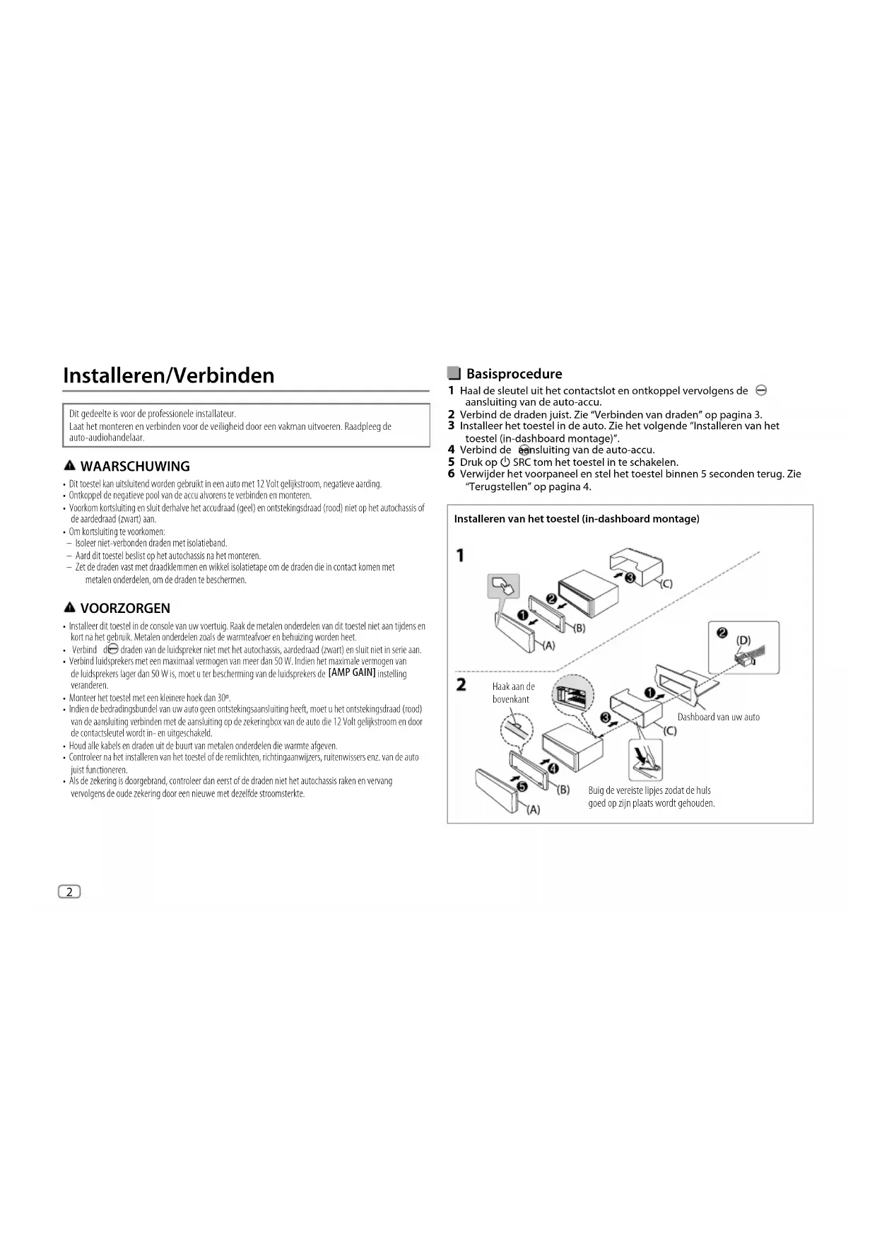 - Si pulsa se accede directamente a BT AUDIO. 2 Para iniciar la reproducción, utilice el reproductor de audio a través de Bluetooth.Para En la placa frontalReproducción/pausa Pulse la rueda de volumen.Seleccione un grupo o carpetaPulse 2 J / 1 K. Omisión hacia atrás/omisión hacia delantePulse S / T. Retroceder/avanzar rápidamentePulse y mantenga pulsado S / T. Repetir reproducciónPulse 4 repetidamente. Reproducción aleatoriaPulse 3 repetidamente. KD-X282DBT_E_B5K-0869-00_SP.indd 8KD-X282DBT_E_B5K-0869-00_SP.indd 8 2022/04/08 13:10:472022/04/08 13:10:47KD-X282DBT_E_B5K-0869-00_SP.indd 9KD-X282DBT_E_B5K-0869-00_SP.indd 9 2022/04/08 13:10:472022/04/08 13:10:472 Data Size: B6L (182 mm x 128 mm)Book Size: B6L (182 mm x 128 mm) Basisprocedure 1 Haal de sleutel uit het contactslot en ontkoppel vervolgens de aansluiting van de auto-accu. 2 Verbind de draden juist. Zie “Verbinden van draden” op pagina3. 3 Installeer het toestel in de auto. Zie het volgende “Installeren van het toestel (in-dashboard montage)”. 4 Verbind de aansluiting van de auto-accu. 5 Druk op B SRC tom het toestel in te schakelen. 6 Verwijder het voorpaneel en stel het toestel binnen 5 seconden terug. Zie “Terugstellen” op pagina4. Installeren van het toestel (in-dashboard montage) Installeren/Verbinden Dit gedeelte is voor de professionele installateur. Laat het monteren en verbinden voor de veiligheid door een vakman uitvoeren. Raadpleeg de auto-audiohandelaar. WAARSCHUWING
