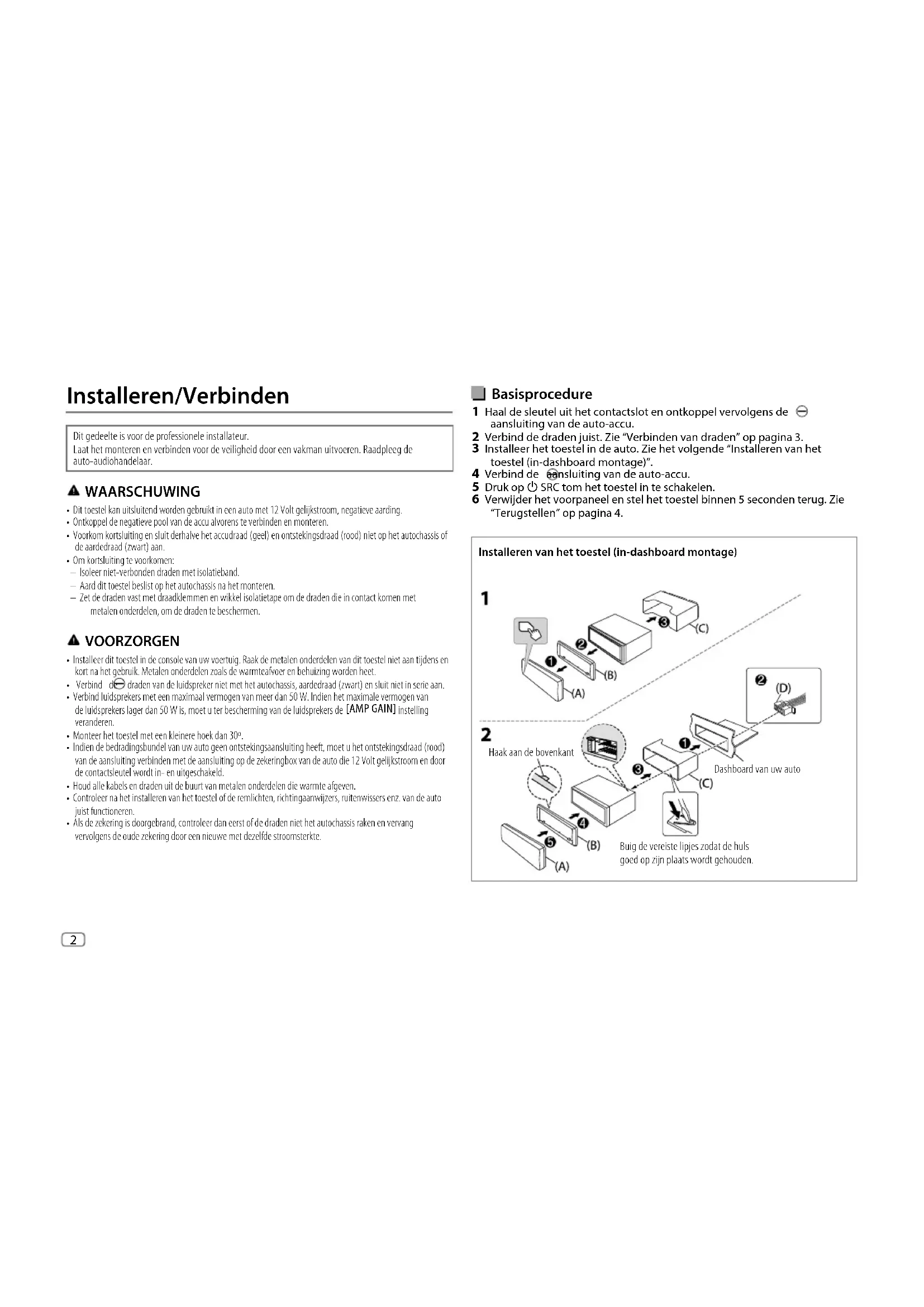 - Si pulsa se accede directamente a BT AUDIO. 2 Para iniciar la reproducción, utilice el reproductor de audio a través de Bluetooth.Para En la placa frontalReproducción/pausa Pulse la rueda de volumen.Seleccione un grupo o carpetaPulse 2 J / 1 K. Omisión hacia atrás/omisión hacia delantePulse S / T. Retroceder/avanzar rápidamentePulse y mantenga pulsado S / T. Repetir reproducciónPulse 4 repetidamente. Reproducción aleatoriaPulse 3 repetidamente. KD-X382BT_E_B5K-0867-00_SP.indd 7KD-X382BT_E_B5K-0867-00_SP.indd 7 2022/04/01 19:38:302022/04/01 19:38:302 Data Size: B6L (182 mm x 128 mm)Book Size: B6L (182 mm x 128 mm) Basisprocedure 1 Haal de sleutel uit het contactslot en ontkoppel vervolgens de aansluiting van de auto-accu. 2 Verbind de draden juist. Zie “Verbinden van draden” op pagina3. 3 Installeer het toestel in de auto. Zie het volgende “Installeren van het toestel (in-dashboard montage)”. 4 Verbind de aansluiting van de auto-accu. 5 Druk op B SRC tom het toestel in te schakelen. 6 Verwijder het voorpaneel en stel het toestel binnen 5 seconden terug. Zie “Terugstellen” op pagina4. Installeren van het toestel (in-dashboard montage) Installeren/Verbinden Dit gedeelte is voor de professionele installateur. Laat het monteren en verbinden voor de veiligheid door een vakman uitvoeren. Raadpleeg de auto-audiohandelaar. WAARSCHUWING