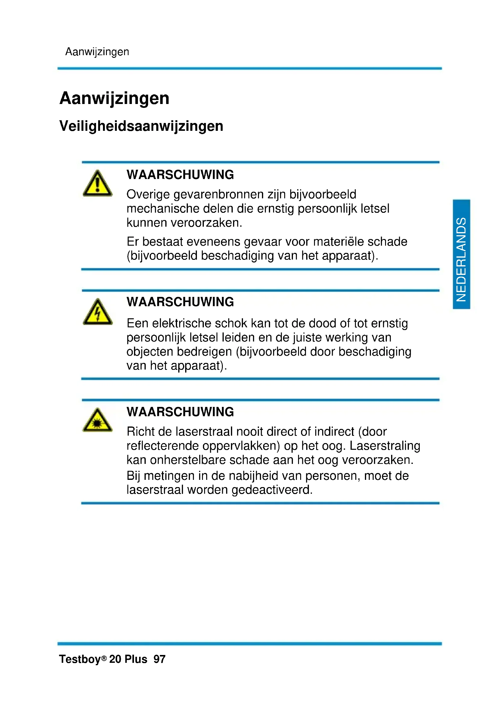 WAARSCHUWING Richt de laserstraal nooit direct of indirect (door reflecterende oppervlakken) op het oog. Laserstraling kan onherstelbare schade aan het oog veroorzaken. Bij metingen in de nabijheid van personen, moet de laserstraal worden gedeactiveerd.Aanwijzingen 98 Testboy