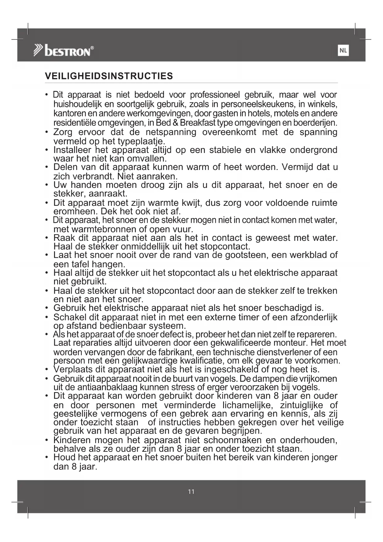- Gebruik dit apparaat nooit in de buurt van vogels. De dampen die vrijkomen uit de antiaanbaklaag kunnen stress of erger veroorzaken bij vogels.