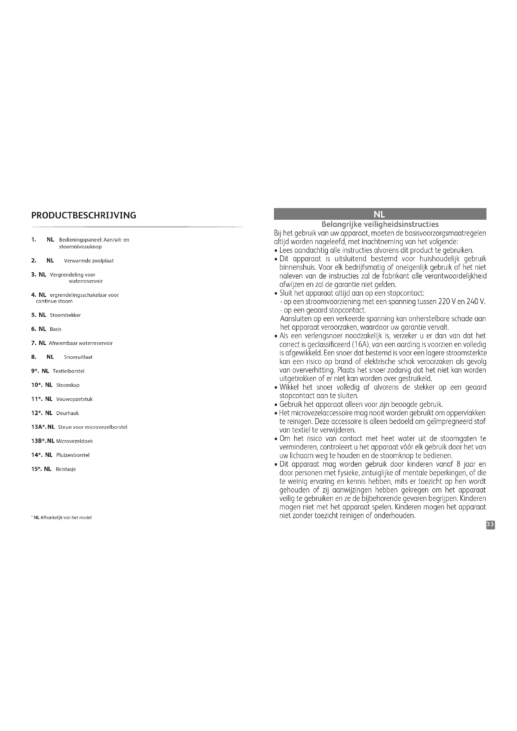 Denk aan het milieu! i Uw apparaat bevat materialen die geschikt zijn voor hergebruik. Lever het in bij het milieustation in uw gemeente of bij onze technische dienst. Problemen met uw kledingstomer? PROBLEEM MOGELIJKE OORZAKEN OPLOSSINGENEr is geen stoom.Het apparaat is niet aangesloten of is uitgeschakeld.Controleer of uw apparaat correct is aangesloten en is ingeschakeld.Het waterpeil is te laag.Trek de stekker van uw apparaat uit het stopcontact en vul het bij.De stoompomp is niet geactiveerd.Houd de stoomknop gedurende enkele seconden ingedrukt om stoom te genereren.U gebruikt het apparaat voor de eerste keer.Houd de stoomknop gedurende enkele seconden ingedrukt om stoom te genereren.Het waterreservoir is niet goed vastgeklikt.Zorg ervoor dat de stop is afgesloten en dat het waterreservoir in het apparaat klikt.Het apparaat staat in de stand-bymodus* of schakelt automatisch uit*.RAADPLEEG HET GEDEELTE ‘STAND-BY/AUTO-OFF’Het apparaat warmt niet op.Het is niet aangesloten of is uitgeschakeld.Steek de stekker weer in het stopcontact en schakel uw apparaat weer in.Het apparaat staat in de stand-bymodus* of schakelt automatisch uit*.RAADPLEEG HET GEDEELTE ‘STAND-BY/AUTO-OFF’Waterlekken.Het waterreservoir is niet goed vastgeklikt of de stop is niet goed afgesloten.Zorg ervoor dat de stop is afgesloten en dat het waterreservoir in het apparaat klikt.De boostmodus is te vaak gebruikt (meer dan 3 keer per minuut)Gebruik de boost niet langer dan 3 keer per minuut.De hoeveelheid stoom neemt af.Er heeft zich kalk gevormd in het apparaatRaadpleeg het gedeelte ‘MAKKELIJK ONTKALKEN’ in de gebruiksaanwijzing.De stoom laat vlekken achter op de stof of het apparaat spettert.U gebruikt water met additieven.Voeg nooit een ander product toe aan het waterreservoir.Het apparaat is niet genoeg gereinigd na de ontkalking.Lees het gedeelte ‘MAKKELIJK ONTKALKEN’ in de gebruiksaanwijzing zorgvuldig door.U gebruikt andere vloeistoffen dan witte azijn om het apparaat te ontkalken.Gebruik alleen witte azijn tijdens de ‘MAKKELIJK ONTKALKEN’-procedure.Het apparaat geeft onafgebroken stoom af.De stoomhendel staat in de vergrendelstand.Ontgrendel de stoomhendel.De steun van de microvezelborstel* is verwijderd van de stoomkop. Microvezeldoek is verwijderd van de steun van de microvezelborstel.Je trekt het textiel te strak.Stoom het textiel zachtjes om geïmpregneerd stof te verwijderen.