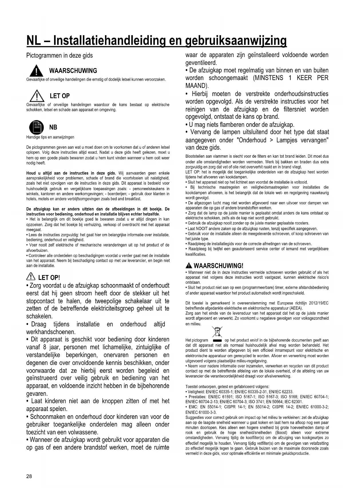 Handige tips en aanwijzingen De pictogrammen geven aan wat u moet doen om te voorkomen dat u of anderen letsel oplopen. Volg deze instructies altijd exact. Nadat u deze gids heeft gelezen, moet u hem op een goede plaats bewaren zodat u hem kunt vinden wanneer u hem ooit weer nodig heeft. Houd u altijd aan de instructies in deze gids. Wij aanvaarden geen enkele aansprakelijkheid voor problemen, schade of brand die voortvloeien uit nalatigheid, zoals het niet opvolgen van de instructies in deze gids. Dit apparaat is bedoeld voor huishoudelijk gebruik en vergelijkbare toepassingen zoals: - personeelskeukens in winkels, kantoren en andere werkomgevingen; - boerderijen; - gebruik door klanten in hotels, motels en andere verblijfsomgevingen zoals bed and breakfast. De afzuigkap kan er anders uitzien dan de afbeeldingen in dit boekje. De instructies voor bediening, onderhoud en installatie blijven echter hetzelfde.