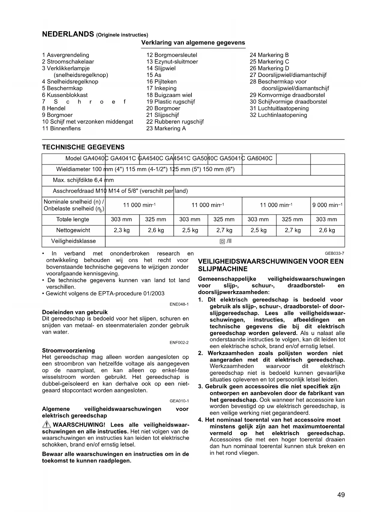 - Gewicht volgens de EPTA-procedure 01/2003 ENE048-1 Doeleinden van gebruik Dit gereedschap is bedoeld voor het slijpen, schuren en snijden van metaal- en steenmaterialen zonder gebruik van water. ENF002-2 Stroomvoorziening Het gereedschap mag alleen worden aangesloten op een stroombron van hetzelfde voltage als aangegeven op de naamplaat, en kan alleen op enkel-fase wisselstroom worden gebruikt. Het gereedschap is dubbel-geïsoleerd en kan derhalve ook op een niet- geaard stopcontact worden aangesloten. GEA010-1 Algemene veiligheidswaarschuwingen voor elektrisch gereedschap WAARSCHUWING! Lees alle veiligheidswaar- schuwingen en alle instructies. Het niet volgen van de waarschuwingen en instructies kan leiden tot elektrische schokken, brand en/of ernstig letsel. Bewaar alle waarschuwingen en instructies om in de toekomst te kunnen raadplegen. GEB033-7