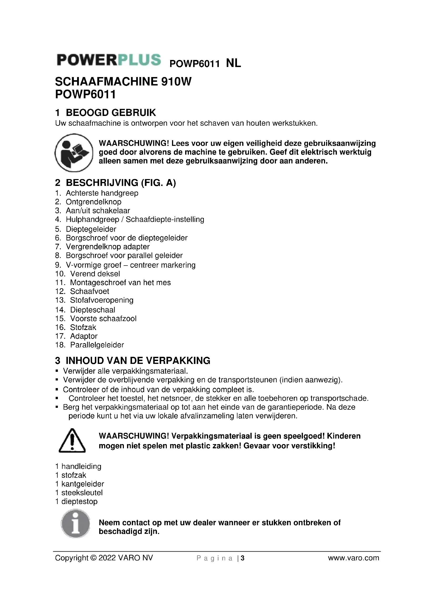 - Berg het verpakkingsmateriaal op tot aan het einde van de garantieperiode. Na deze periode kunt u het via uw lokale afvalinzameling laten verwijderen. WAARSCHUWING! Verpakkingsmateriaal is geen speelgoed! Kinderen mogen niet spelen met plastic zakken! Gevaar voor verstikking! 1 handleiding 1 stofzak 1 kantgeleider 1 steeksleutel 1 dieptestop Neem contact op met uw dealer wanneer er stukken ontbreken of beschadigd zijn.POWP6011 NL Copyright © 2022 VARO NV P a g i n a | 4 www.varo.com