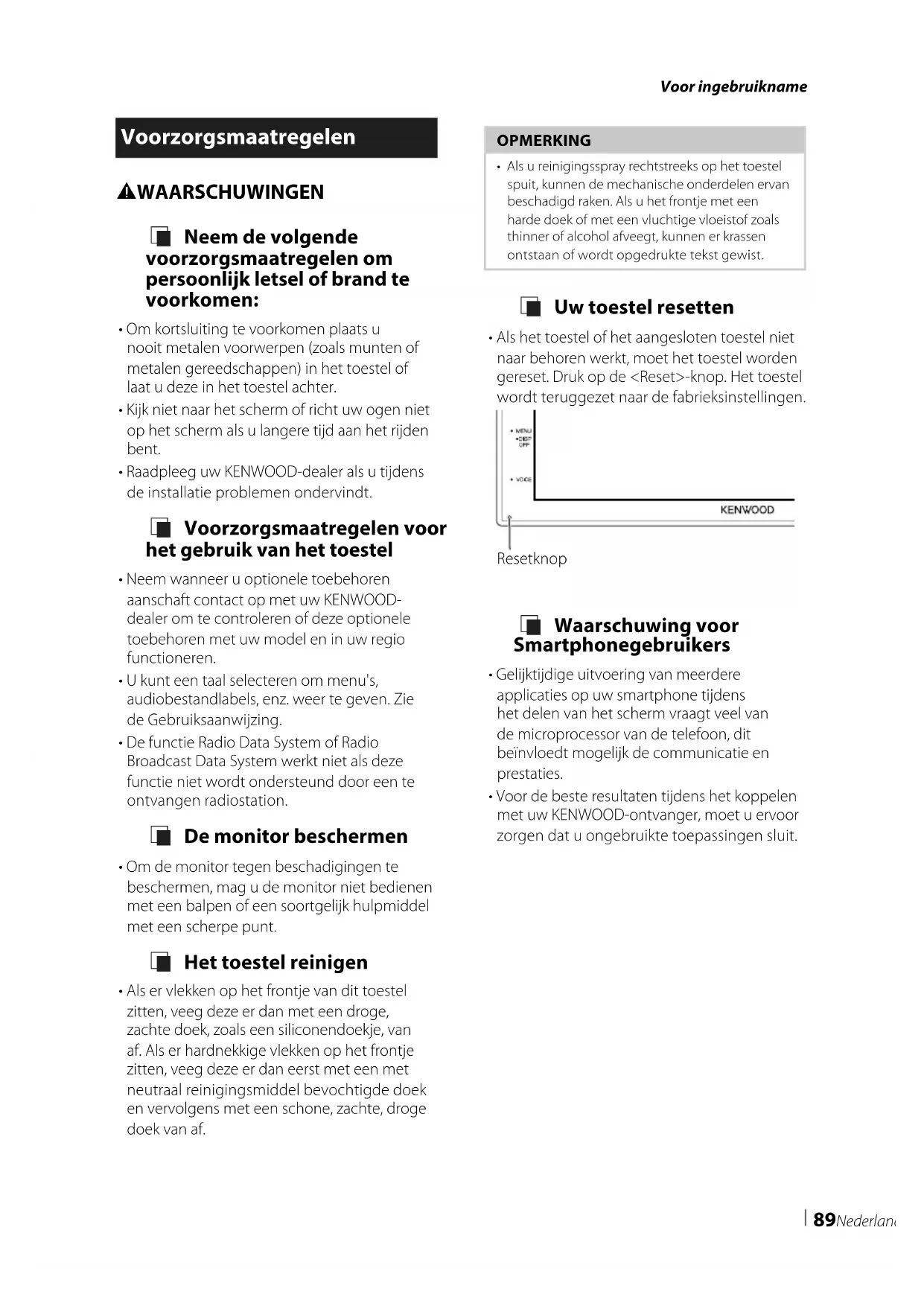 - Taal voor aanduidingen: De schermaanduidingen voor de uitleg worden in het Engels getoond. U kunt de taal voor de aanduidingen kiezen met het [SETUP] menu. Zie de Gebruiksaanwijzing. Voor ingebruikname ...............................................88 Over de snelstartgids ....................................................................... 88 De handleiding gebruiken ........................................................... 88 Voorzorgsmaatregelen ...................................................................89 Basisbediening ..........................................................90 Functies van de knoppen op het voorpaneel..................90 Het toestel inschakelen .................................................................. 90 Aan de Slag ............................................................................................ 91 Instellen van het volume ............................................................... 92 Gebruik aanraakscherm .................................................................92 Beschrijvingen van het startscherm ....................................... 93 Beschrijvingen bronselectiescherm ....................................... 93 Beschrijvingen bronbedieningsscherm ............................... 95 MENU-scherm ...................................................................................... 96 Lijstscherm .............................................................................................96 USB ................................................................................97 Een USB-apparaat aansluiten......................................................97 Basisbediening van de USB..........................................................97 Radio .............................................................................98 Basisbediening van de radio ....................................................... 98 Geheugenfunctie ............................................................................... 99 DAB ............................................................................. 100 Basisbediening van de DAB ......................................................100 Opslaan van services in het preselectie-geheugen .. 101 Bluetoothregeling .................................................102 Registreer vanaf het Bluetooth-apparaat ......................... 102 De handsfree-eenheid gebruiken ........................................ 103 Audio regelen ......................................................... 106 Verbinden/installeren .......................................... 108 Vóór de installatie ............................................................................108 De unit installeren...........................................................................109 Appendix .................................................................. 113 Technische gegevens ...................................................................113 Informatie over dit toestel ......................................................... 113 !B5H-0358-07_QSG_DMX_E_EnFrDeNl.indb 88 2020/07/09 11:04Voor ingebruikname 89Nederlands Voorzorgsmaatregelen #WAARSCHUWINGEN Ñ Neem de volgende voorzorgsmaatregelen om persoonlijk letsel of brand te voorkomen: