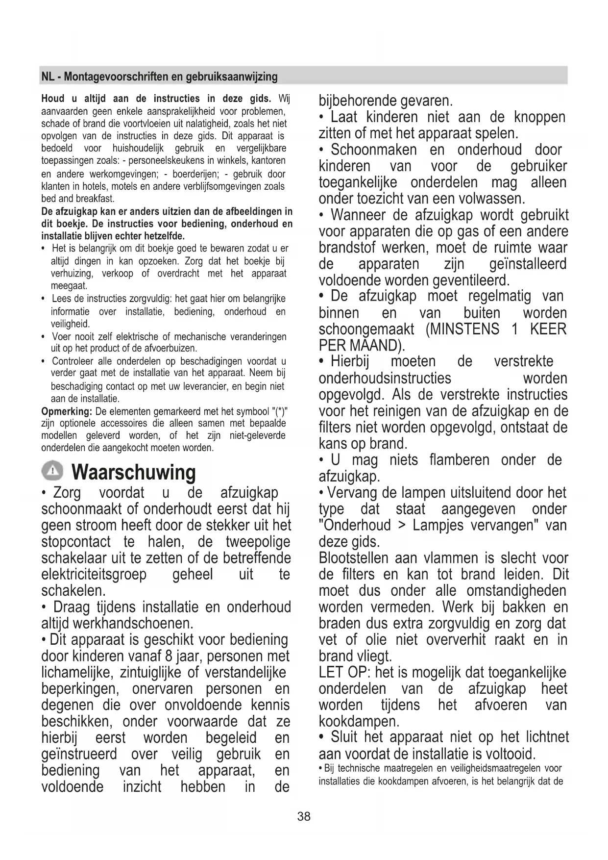 - Hierbij moeten de verstrekte onderhoudsinstructies worden opgevolgd. Als de verstrekte instructies voor het reinigen van de afzuigkap en de filters niet worden opgevolgd, ontstaat de kans op brand.