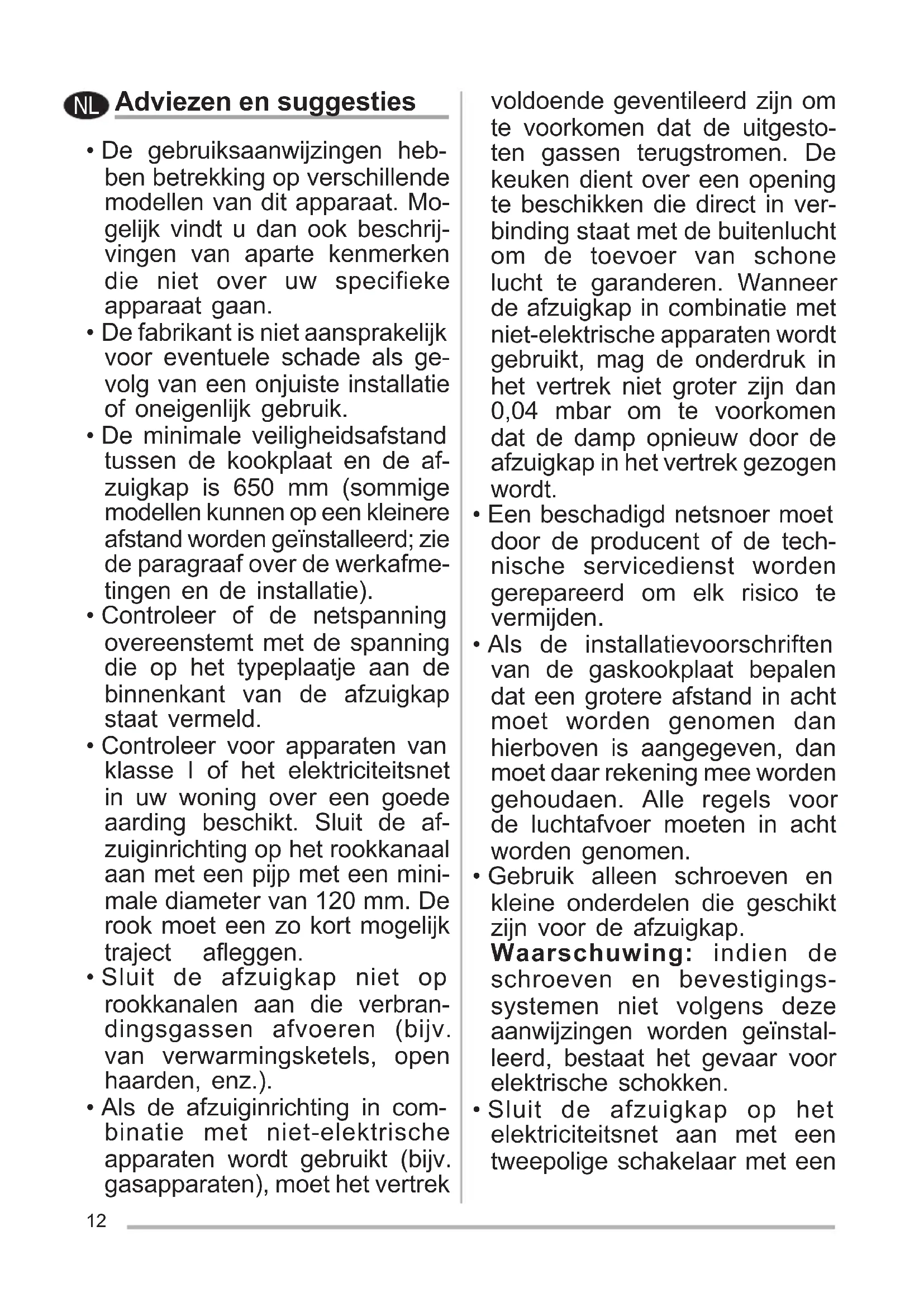 - Gebruik de afzuigkap nooit voor andere doeleinden dan waarvoor hij bedoeld is.