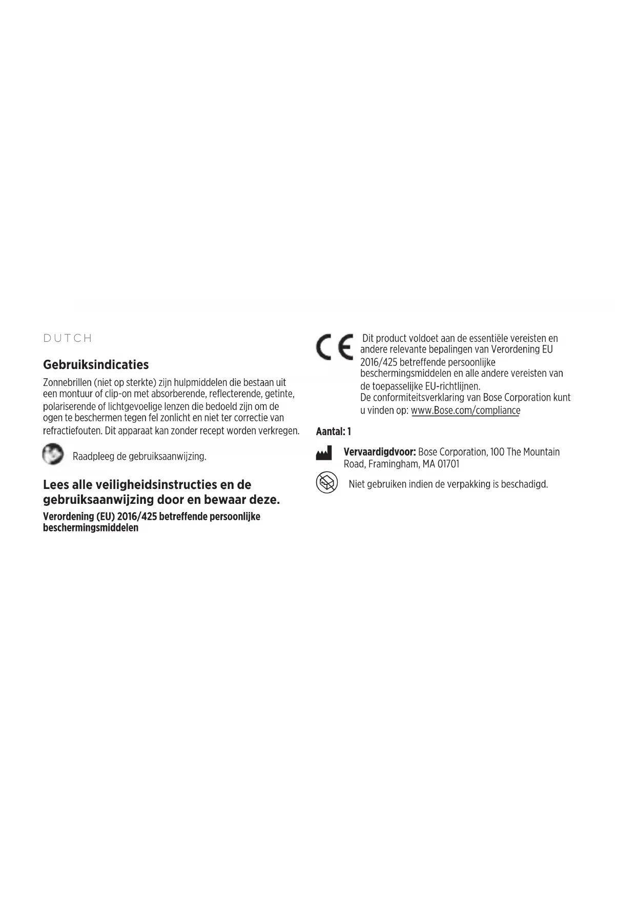 Videos Warnung/ VorsichtsmaßnahmenDUTCH Gebruiksindicaties Zonnebrillen (niet op sterkte) zijn hulpmiddelen die bestaan uit een montuur of clip-on met absorberende, reflecterende, getinte, polariserende of lichtgevoelige lenzen die bedoeld zijn om de ogen te beschermen tegen fel zonlicht en niet ter correctie van refractiefouten. Dit apparaat kan zonder recept worden verkregen. Raadpleeg de gebruiksaanwijzing. Lees alle veiligheidsinstructies en de gebruiksaanwijzing door en bewaar deze. Verordening (EU) 2016/425 betreffende persoonlijke beschermingsmiddelen Dit product voldoet aan de essentiële vereisten en andere relevante bepalingen van Verordening EU 2016/425 betreffende persoonlijke beschermingsmiddelen en alle andere vereisten van de toepasselijke EU-richtlijnen. Deconformiteitsverklaring van Bose Corporation kunt u vinden op: www.Bose.com/compliance Aantal: 1