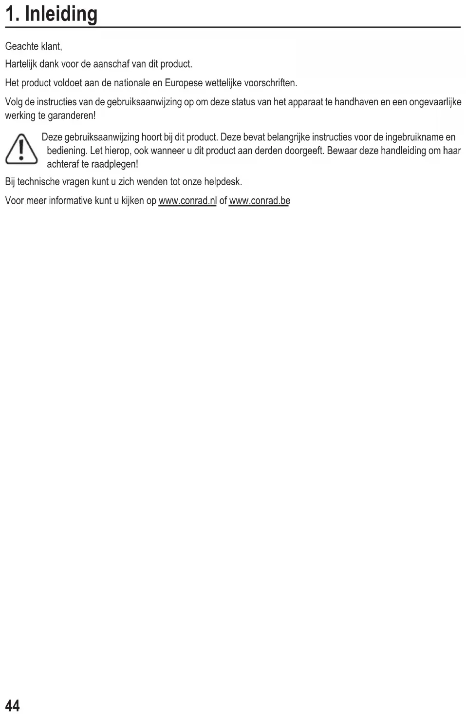 Geachte klant, Hartelijk dank voor de aanschaf van dit product. Het product voldoet aan de nationale en Europese wettelijke voorschriften. Volg de instructies van de gebruiksaanwijzing op om deze status van het apparaat te handhaven en een ongevaarlijke werking te garanderen! Deze gebruiksaanwijzing hoort bij dit product. Deze bevat belangrijke instructies voor de ingebruikname en bediening. Let hierop, ook wanneer u dit product aan derden doorgeeft. Bewaar deze handleiding om haar achteraf te raadplegen! Bij technische vragen kunt u zich wenden tot onze helpdesk. Voor meer informative kunt u kijken op www.conrad.nl of www.conrad.be45