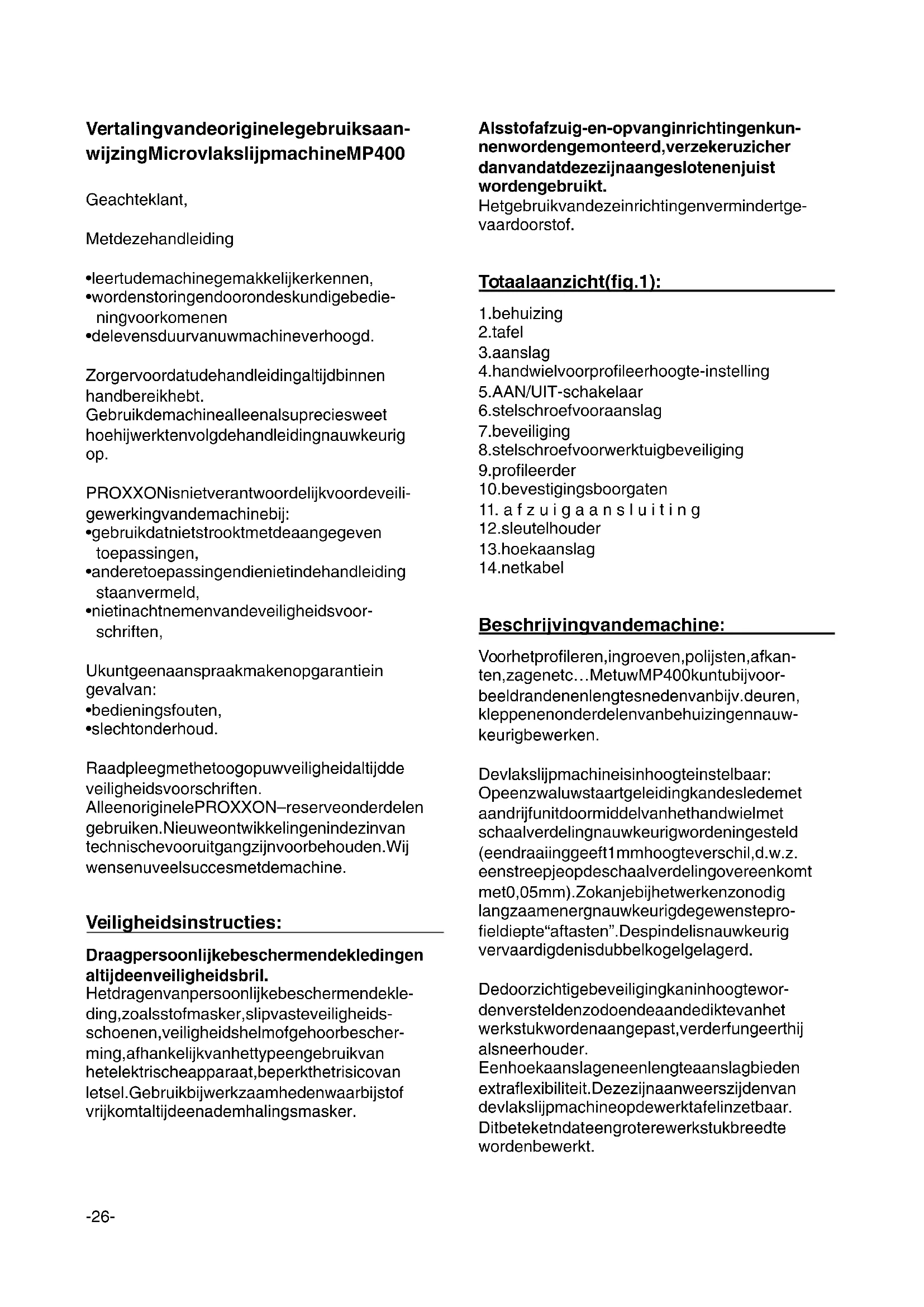 - slecht onderhoud. Raadpleeg met het oog op uw veiligheid altijd de veiligheidsvoorschriften. Alleen originele PROXXON – reserveonderdelen gebruiken. Nieuwe ontwikkelingen in de zin van technische vooruitgang zijn voorbehouden. Wij wensen u veel succes met de machine. Veiligheidsinstructies: Draag persoonlijke beschermende kleding en altijd een veiligheidsbril. Het dragen van persoonlijke beschermende kle- ding, zoals stofmasker, slipvaste veiligheids- schoenen, veiligheidshelm of gehoorbescher- ming, afhankelijk van het type en gebruik van het elektrische apparaat, beperkt het risico van letsel. Gebruik bij werkzaamheden waarbij stof vrijkomt altijd een ademhalingsmasker. Als stofafzuig- en -opvanginrichtingen kun- nen worden gemonteerd, verzeker u zich er dan van dat deze zijn aangesloten en juist worden gebruikt. Het gebruik van deze inrichtingen vermindert ge- vaar door stof. Totaalaanzicht (fig. 1):