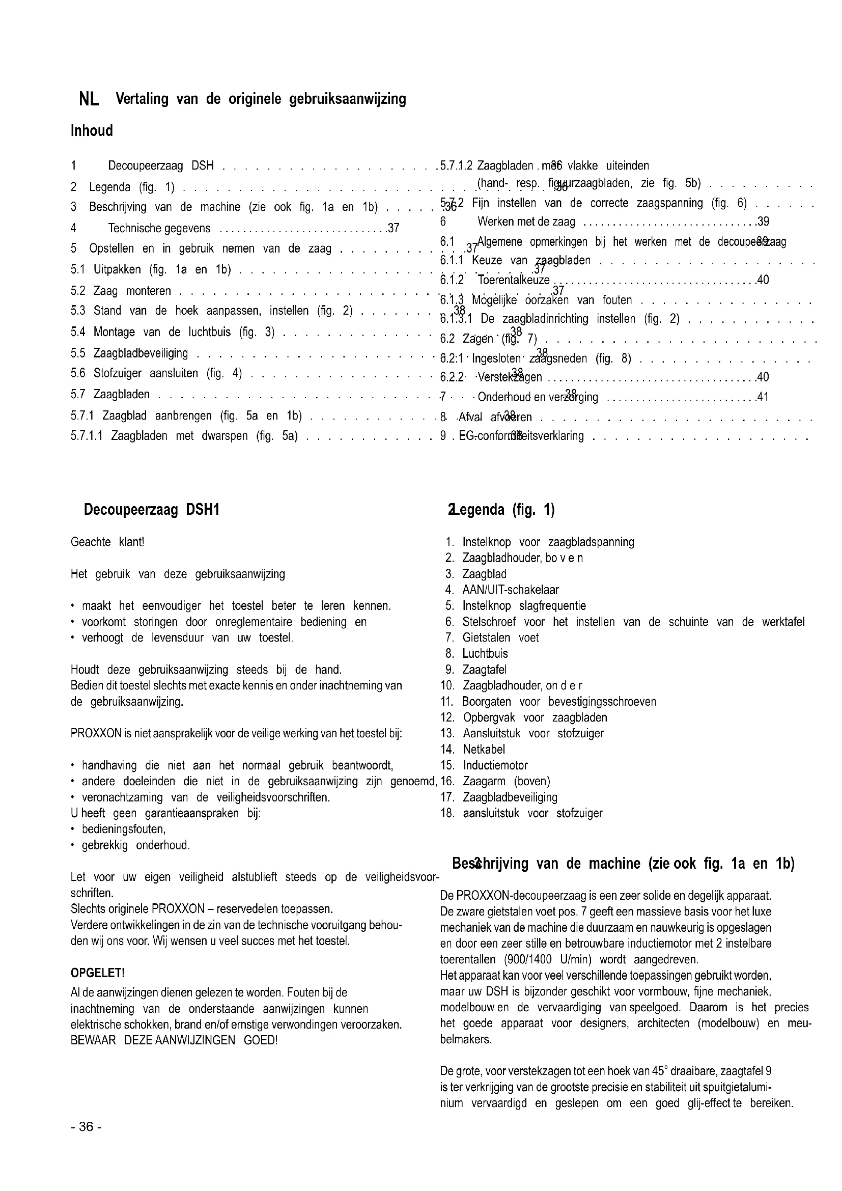 3 Beschrijving van de machine (zie ook fig. 1a en 1b) . . . . . . 5262 Fijn instellen van de correcte zaagspanning (fig. 6) . . . . .