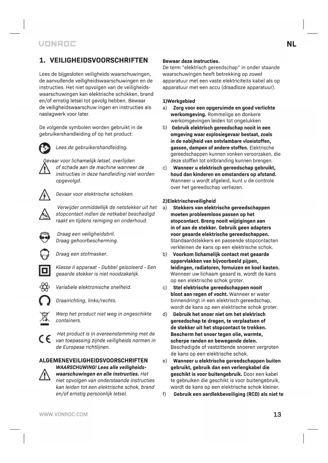 VONROC producten zijn ontworpen volgens de hoogste kwaliteitstandaarden en gegardeerd vrij van defecten, zowel materieel als fabrieksfouten, tijdens de wettelijk vastgestelde garantieperiode vanaf de eerste aankoopdatum. Mocht het product tijdens dezeperiode gebreken vertonen veroorzaakt door defecte materialen en/of fabrieksfouten, neem danrechtstreeks contact op met VONROC.