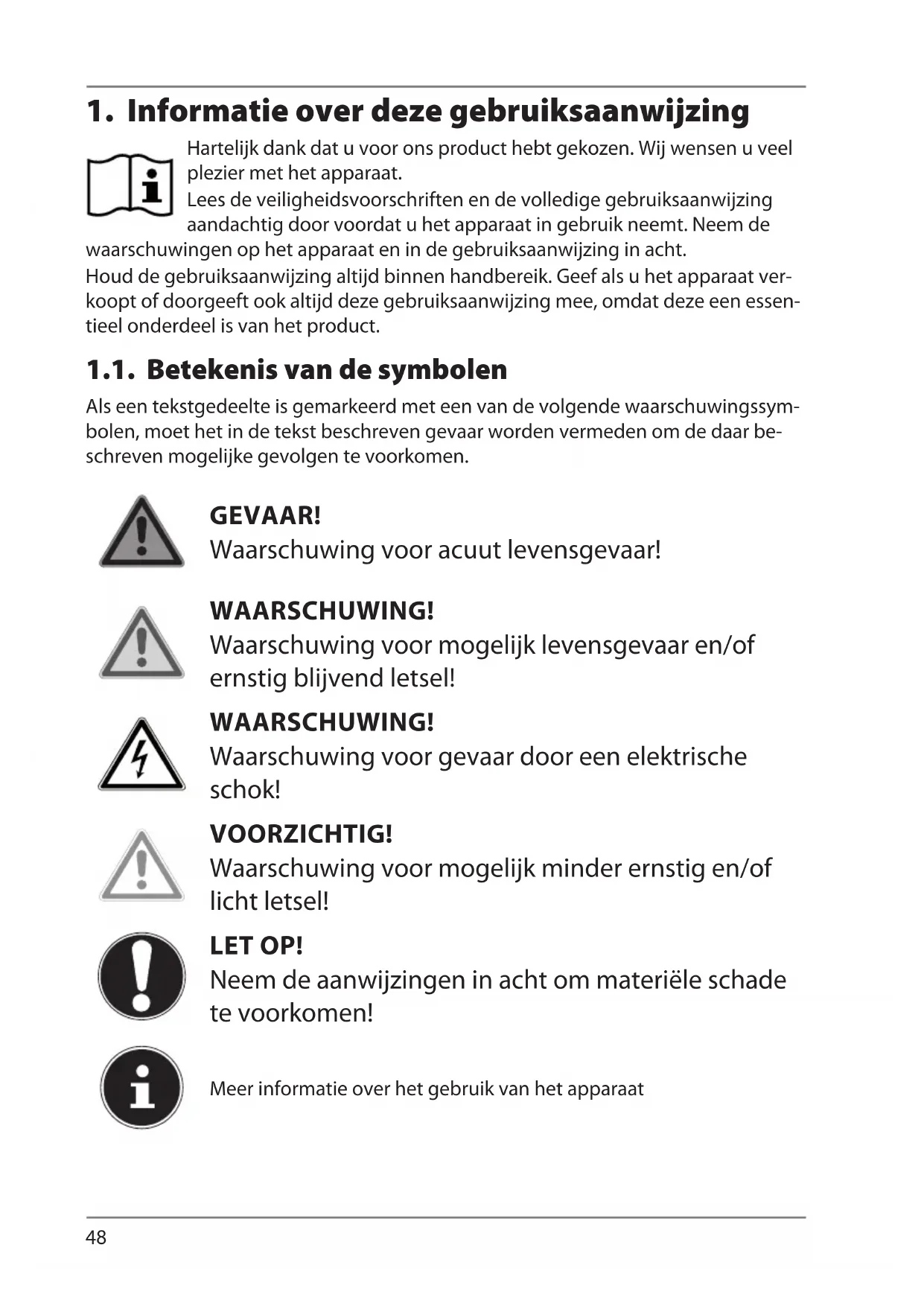 Hartelijk dank dat u voor ons product hebt gekozen. Wij wensen u veel plezier met het apparaat. Lees de veiligheidsvoorschriften en de volledige gebruiksaanwijzing aandachtig door voordat u het apparaat in gebruik neemt. Neem de waarschuwingen op het apparaat en in de gebruiksaanwijzing in acht. Houd de gebruiksaanwijzing altijd binnen handbereik. Geef als u het apparaat ver- koopt of doorgeeft ook altijd deze gebruiksaanwijzing mee, omdat deze een essen- tieel onderdeel is van het product. 1.1. Betekenis van de symbolen Als een tekstgedeelte is gemarkeerd met een van de volgende waarschuwingssym- bolen, moet het in de tekst beschreven gevaar worden vermeden om de daar be- schreven mogelijke gevolgen te voorkomen. GEVAAR! Waarschuwing voor acuut levensgevaar! WAARSCHUWING! Waarschuwing voor mogelijk levensgevaar en/of ernstig blijvend letsel! WAARSCHUWING! Waarschuwing voor gevaar door een elektrische schok! VOORZICHTIG! Waarschuwing voor mogelijk minder ernstig en/of licht letsel! LET OP! Neem de aanwijzingen in acht om materiële schade te voorkomen! Meer informatie over het gebruik van het apparaatDE