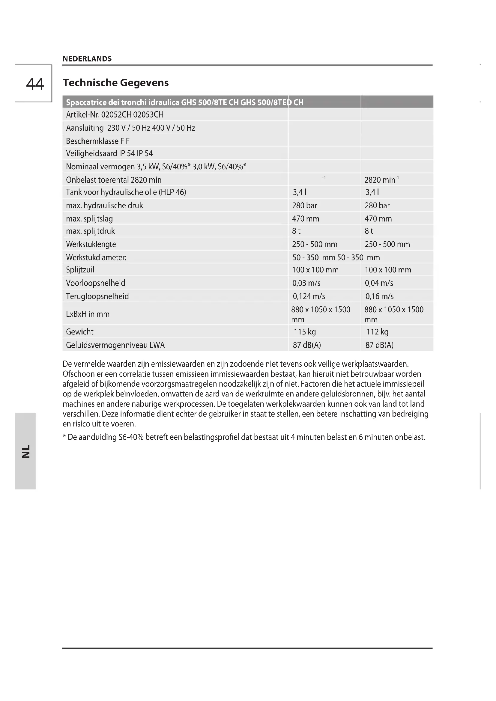 Gewicht 115 kg 112 kg Geluidsvermogenniveau LWA 87 dB(A) 87 dB(A) De vermelde waarden zijn emissiewaarden en zijn zodoende niet tevens ook veilige werkplaatswaarden. Ofschoon er een correlatie tussen emissieen immissiewaarden bestaat, kan hieruit niet betrouwbaar worden afgeleid of bijkomende voorzorgsmaatregelen noodzakelijk zijn of niet. Factoren die het actuele immissiepeil op de werkplek beïnvloeden, omvatten de aard van de werkruimte en andere geluidsbronnen, bijv. het aantal machines en andere naburige werkprocessen. De toegelaten werkplekwaarden kunnen ook van land tot land verschillen. Deze informatie dient echter de gebruiker in staat te stellen, een betere inschatting van bedreiging en risico uit te voeren.