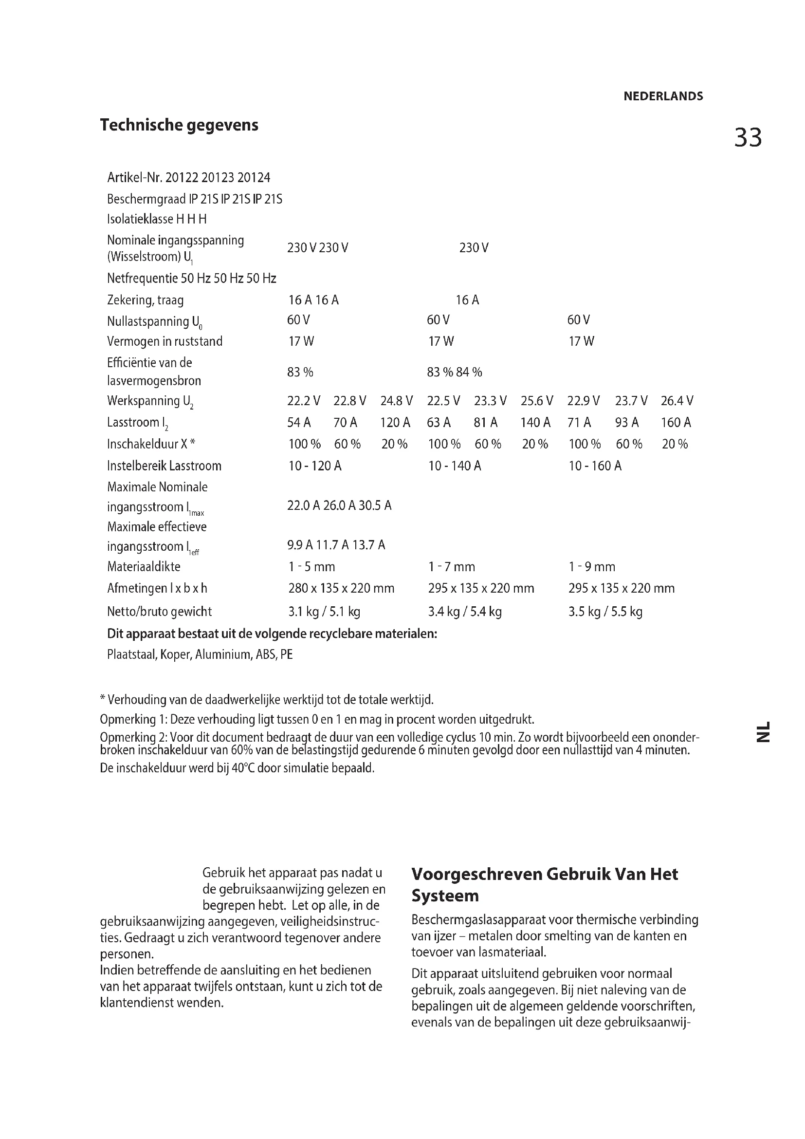 Materiaaldikte 1 5 mm 1 7 mm 1 9 mm Afmetingen l x b x h 280 x 135 x 220 mm 295 x 135 x 220 mm 295 x 135 x 220 mm Netto/bruto gewicht 3.1 kg / 5.1 kg 3.4 kg / 5.4 kg 3.5 kg / 5.5 kg Dit apparaat bestaat uit de volgende recyclebare materialen: Plaatstaal, Koper, Aluminium, ABS, PE