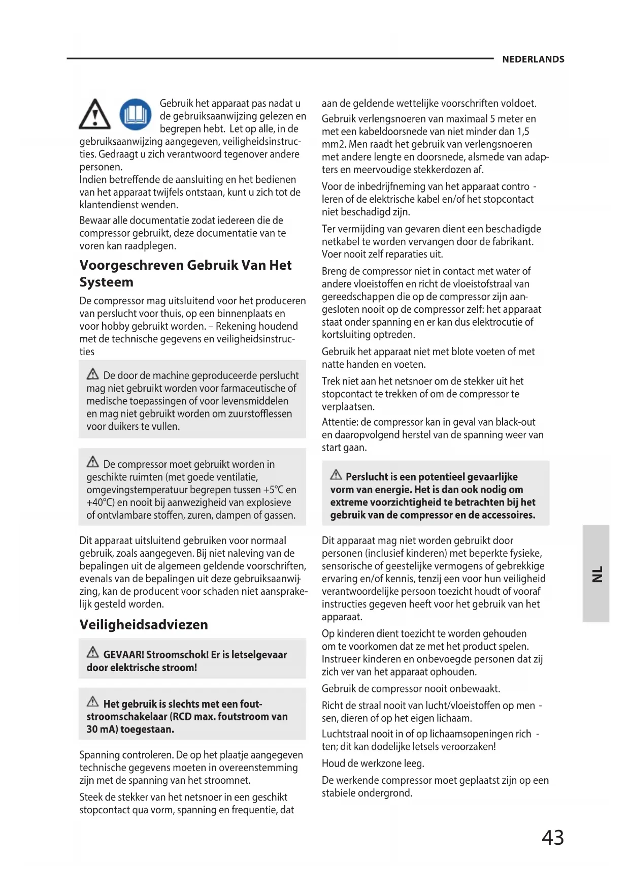 Gebruik het apparaat pas nadat u de gebruiksaanwijzing gelezen en begrepen hebt. Let op alle, in de gebruiksaanwijzing aangegeven, veiligheidsinstruc- ties. Gedraagt u zich verantwoord tegenover andere personen. Indien betreende de aansluiting en het bedienen van het apparaat twijfels ontstaan, kunt u zich tot de klantendienst wenden. Bewaar alle documentatie zodat iedereen die de compressor gebruikt, deze documentatie van te voren kan raadplegen. Voorgeschreven Gebruik Van Het Systeem De compressor mag uitsluitend voor het produceren van perslucht voor thuis, op een binnenplaats en voor hobby gebruikt worden. – Rekening houdend met de technische gegevens en veiligheidsinstruc- ties De door de machine geproduceerde perslucht mag niet gebruikt worden voor farmaceutische of medische toepassingen of voor levensmiddelen en mag niet gebruikt worden om zuurstoessen voor duikers te vullen. De compressor moet gebruikt worden in geschikte ruimten (met goede ventilatie, omgevingstemperatuur begrepen tussen +5°C en +40°C) en nooit bij aanwezigheid van explosieve of ontvlambare stoen, zuren, dampen of gassen. Dit apparaat uitsluitend gebruiken voor normaal gebruik, zoals aangegeven. Bij niet naleving van de bepalingen uit de algemeen geldende voorschriften, evenals van de bepalingen uit deze gebruiksaanwij
